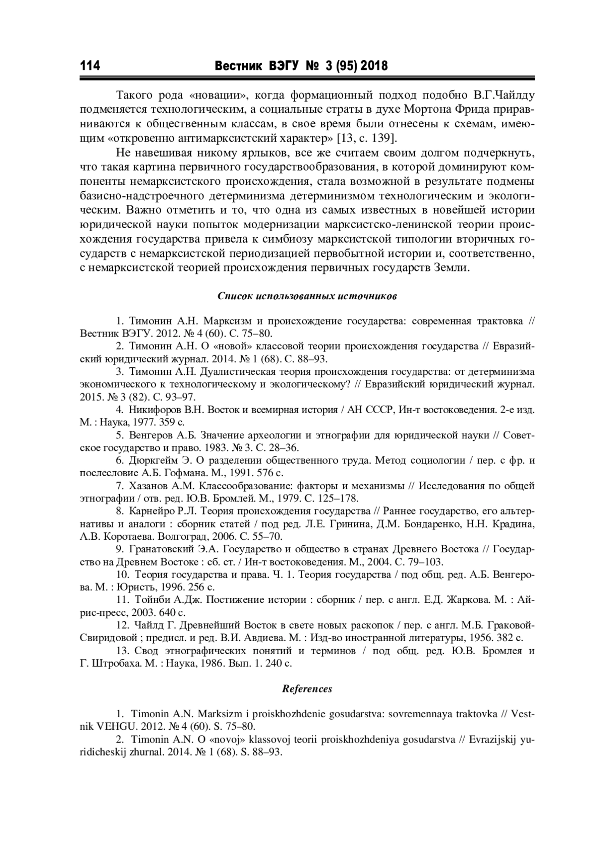 2. Тимонин А.Н. О «новой» классовой теории происхождения государства // Евразийский юридический журнал. 2014. № 1 (68). С. 88-93. EDN: RUOQJD