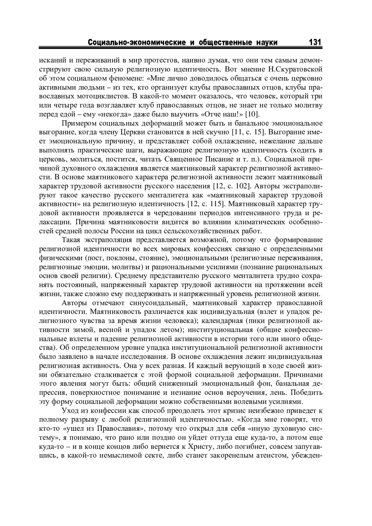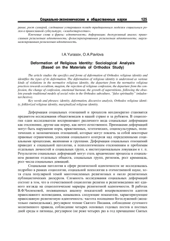 В настоящей статье исследуются специфика и формы деформации православной религиозной идентичности, выявляются виды ее деформации. Под деформацией религиозной идентичности в работе понимаются различного рода нарушения в нормативной религиозной идентичности, уход от нормативных религиозных практик в сторону оккультизма, магизма, отказ от религиозного исповедания, уход из конфессии, смена конфессии, эмоциональное выгорание, рост суеверий, следование устаревшим псевдо традиционным моделям социальным ролям в православной субкультуре, «младостарчество».