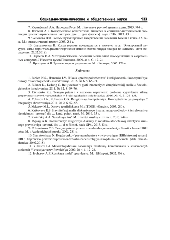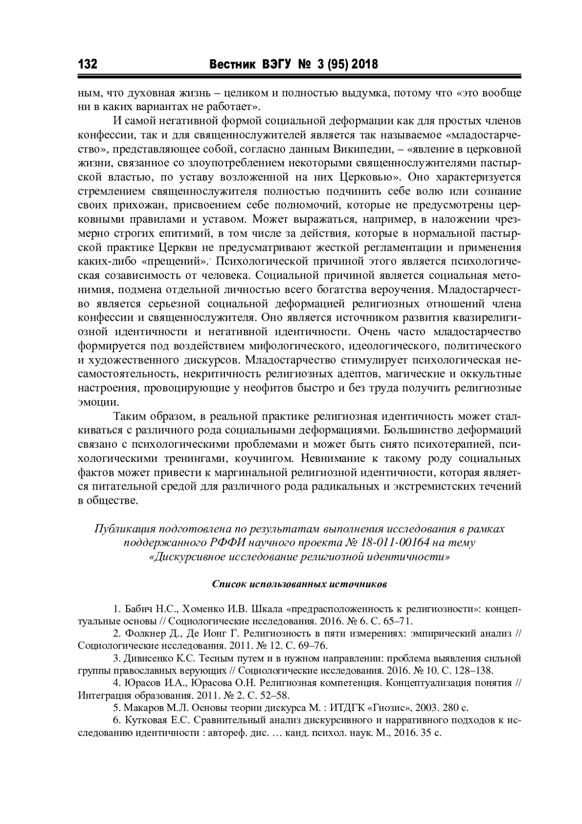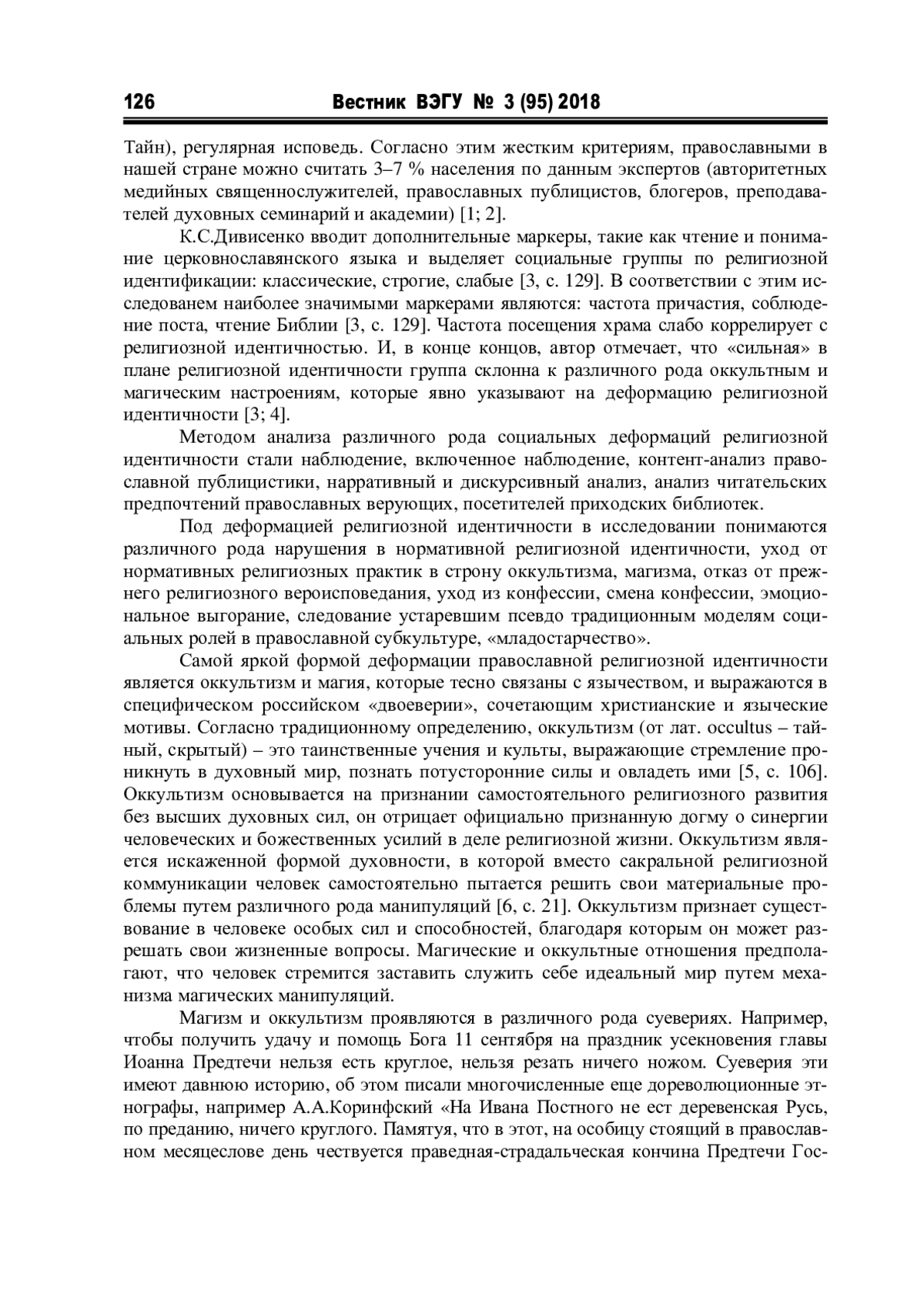 3. Дивисенко К.С. Тесным путем и в нужном направлении: проблема выявления сильной группы православных верующих // Социологические исследования. 2016. № 10. С. 128-138. EDN: WVJPCF