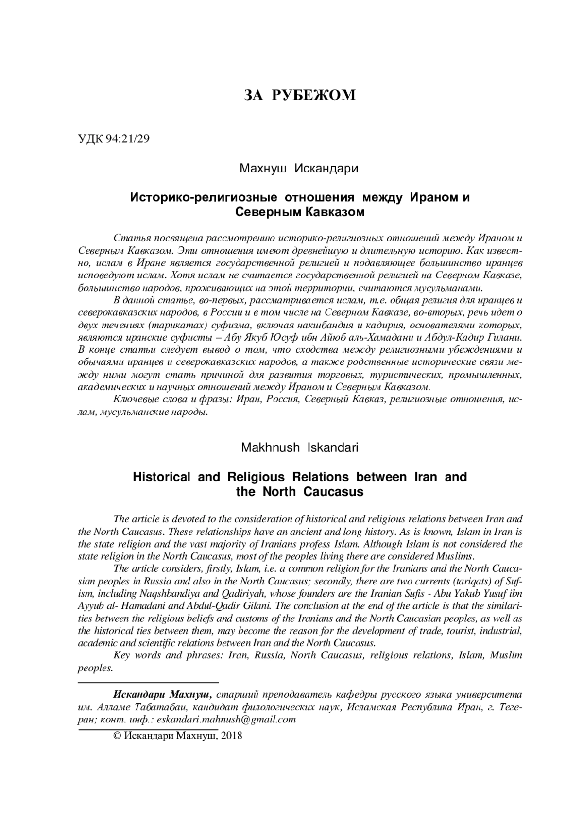 Статья посвящена рассмотрению историко-религиозных отношений между Ираном и Северным Кавказом. Эти отношения имеют древнейшую и длительную историю. Как известно, ислам в Иране является государственной религией и подавляющее большинство иранцев исповедуют ислам. Хотя ислам не считается государственной религией на Северном Кавказе, большинство народов, проживающих на этой территории, считаются мусульманами. В данной статье, во-первых, рассматривается ислам, т. е. общая религия для иранцев и северокавказских народов, в России и в том числе на Северном Кавказе, во-вторых, речь идет о двух течениях (тарикатах) суфизма, включая накшбандия и кадирия, основателями которых, являются иранские суфисты – Абу Якуб Юсуф ибн Айюб аль-Хамадани и Абдул-Кадир Гилани. В конце статьи следует вывод о том, что сходства между религиозными убеждениями и обычаями иранцев и северокавказских народов, а также родственные исторические связи между ними могут стать причиной для развития торговых, туристических, промышленных, академических и научных отношений между Ираном и Северным Кавказом