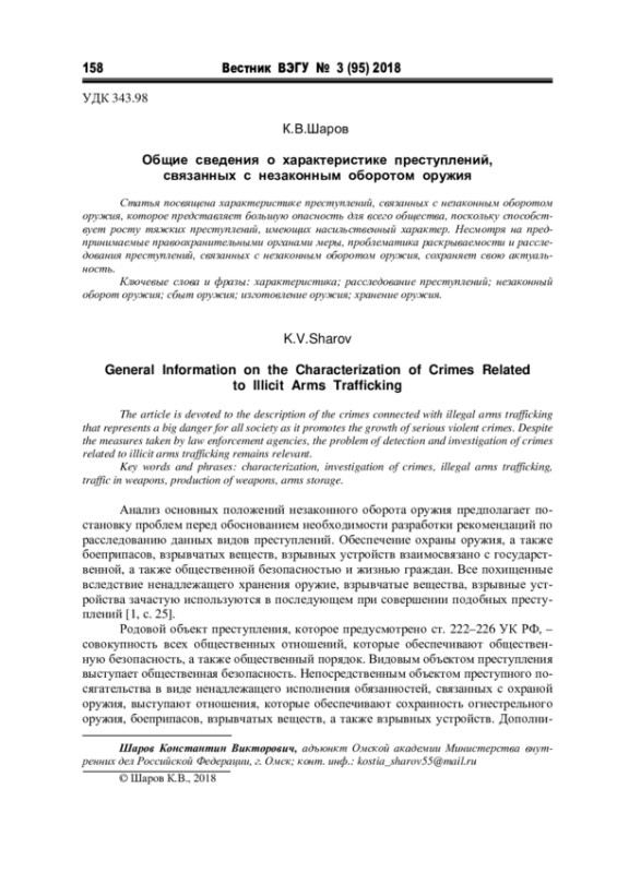 Статья посвящена характеристике преступлений, связанных с незаконным оборотом оружия, которое представляет большую опасность для всего общества, поскольку способствует росту тяжких преступлений, имеющих насильственный характер. Несмотря на предпринимаемые правоохранительными органами меры, проблематика раскрываемости и расследования преступлений, связанных с незаконным оборотом оружия, сохраняет свою актуальность
