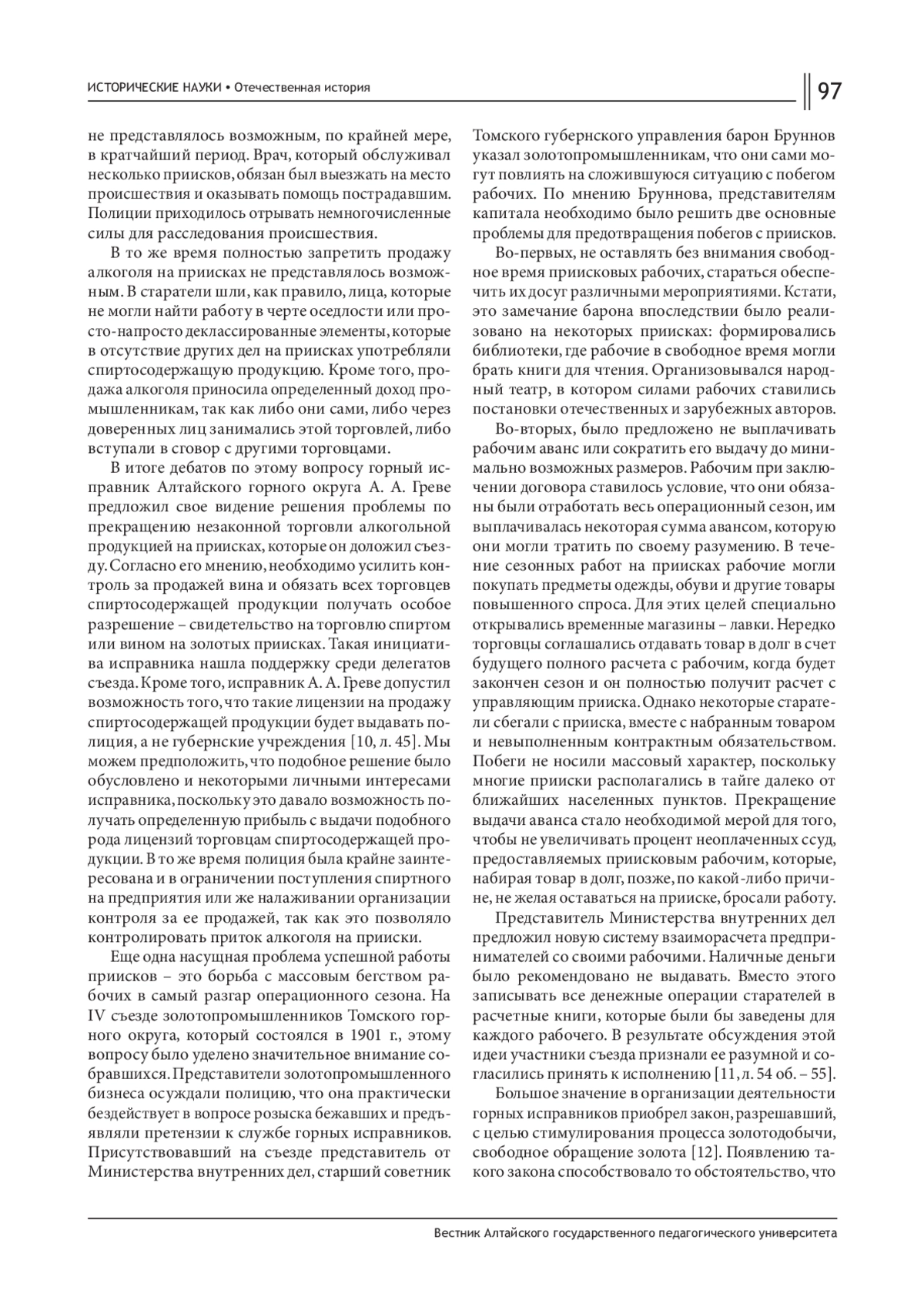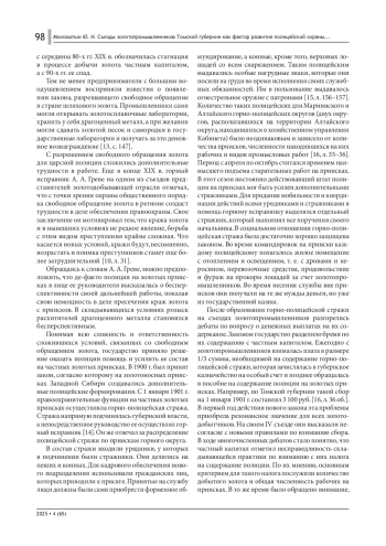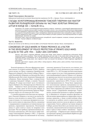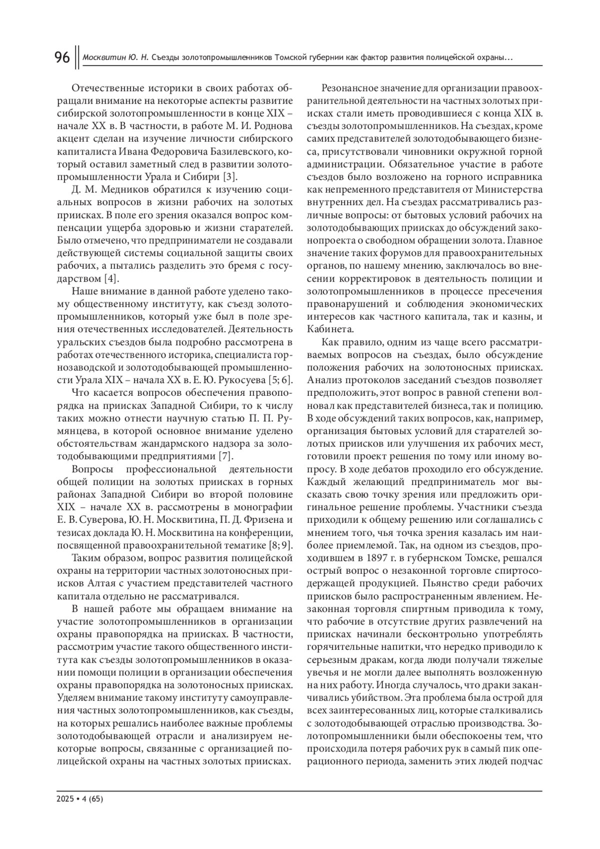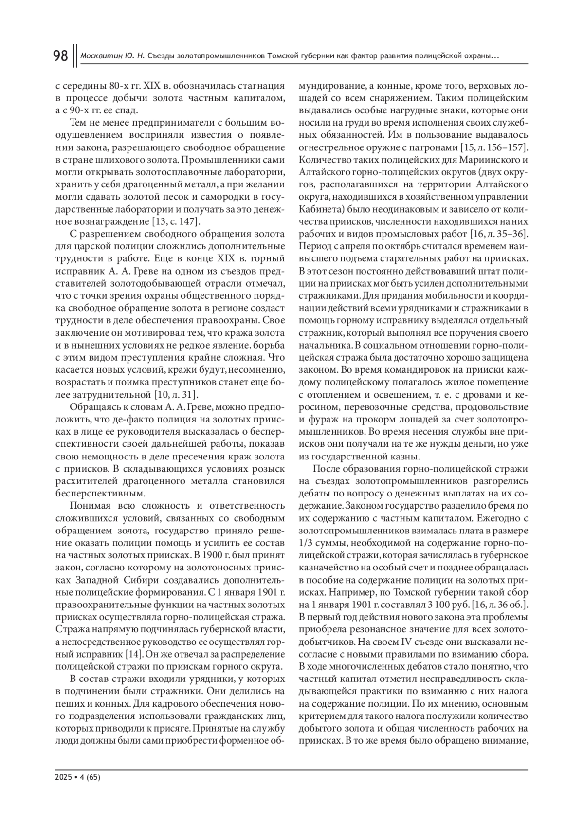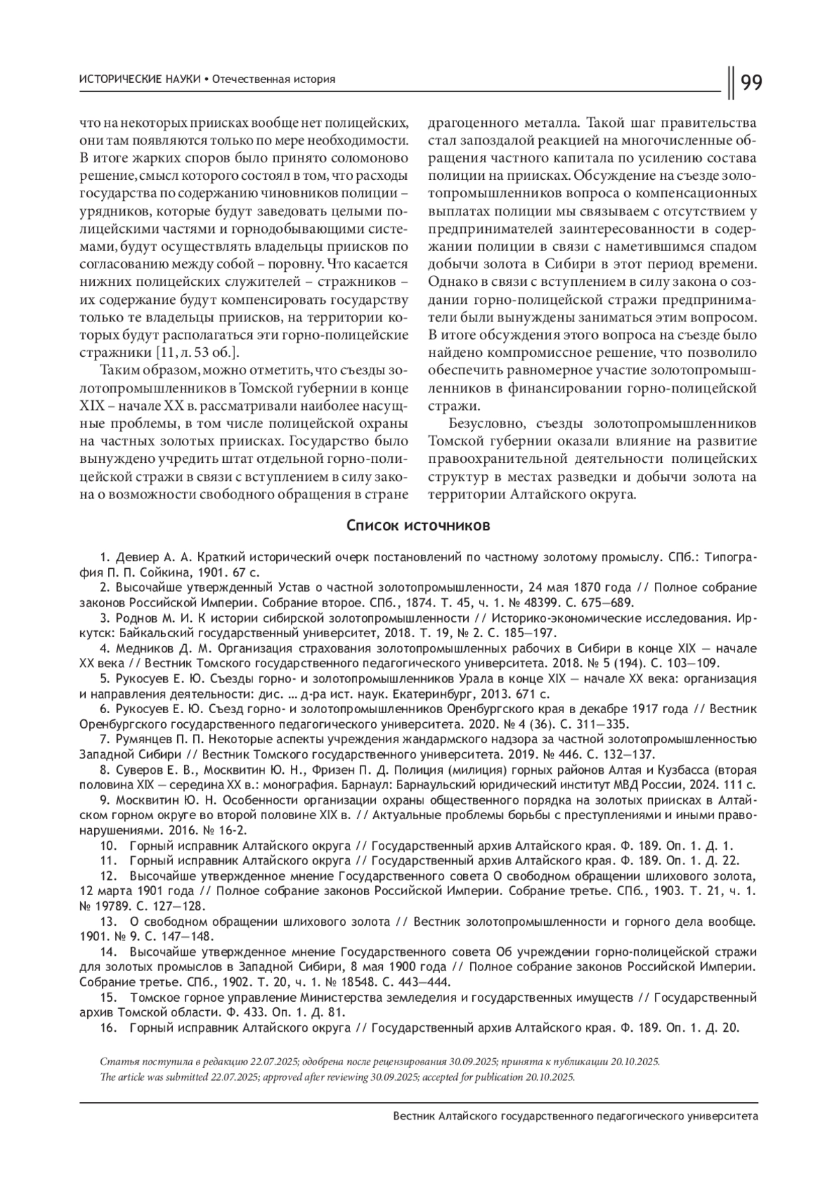 9. Москвитин Ю. Н. Особенности организации охраны общественного порядка на золотых приисках в Алтайском горном округе во второй половине XIX в. // Актуальные проблемы борьбы с преступлениями и иными правонарушениями. 2016. № 16-2. EDN: VOFCNT