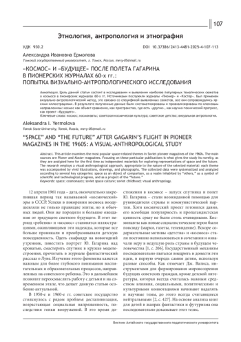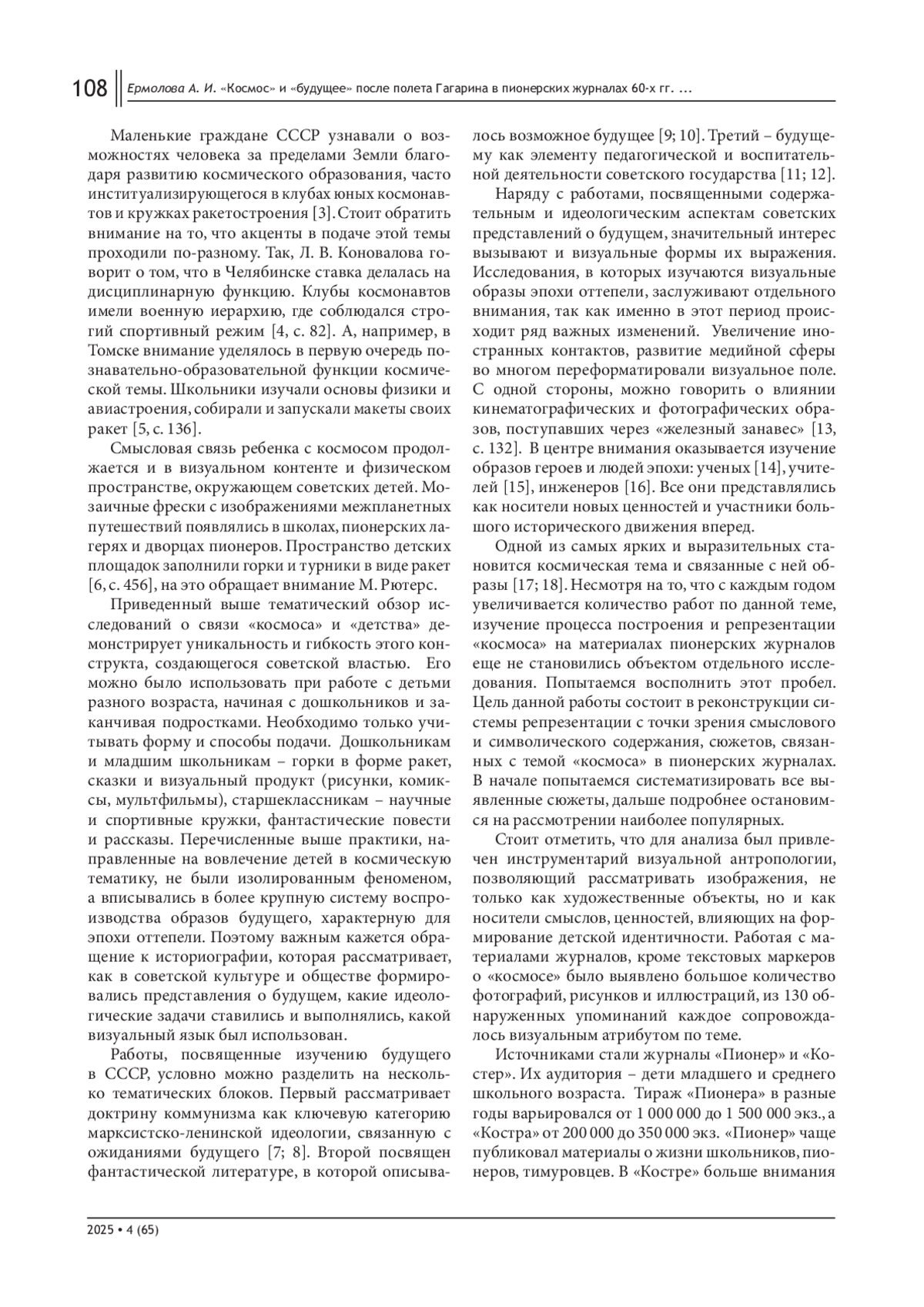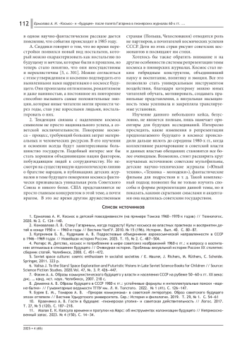 1. Ермолова А. И. Космос в детской повседневности (на примере Томска 1960-1970-х годов) // Технологос. 2020. № 2. С. 124-140. EDN: IFNVNF