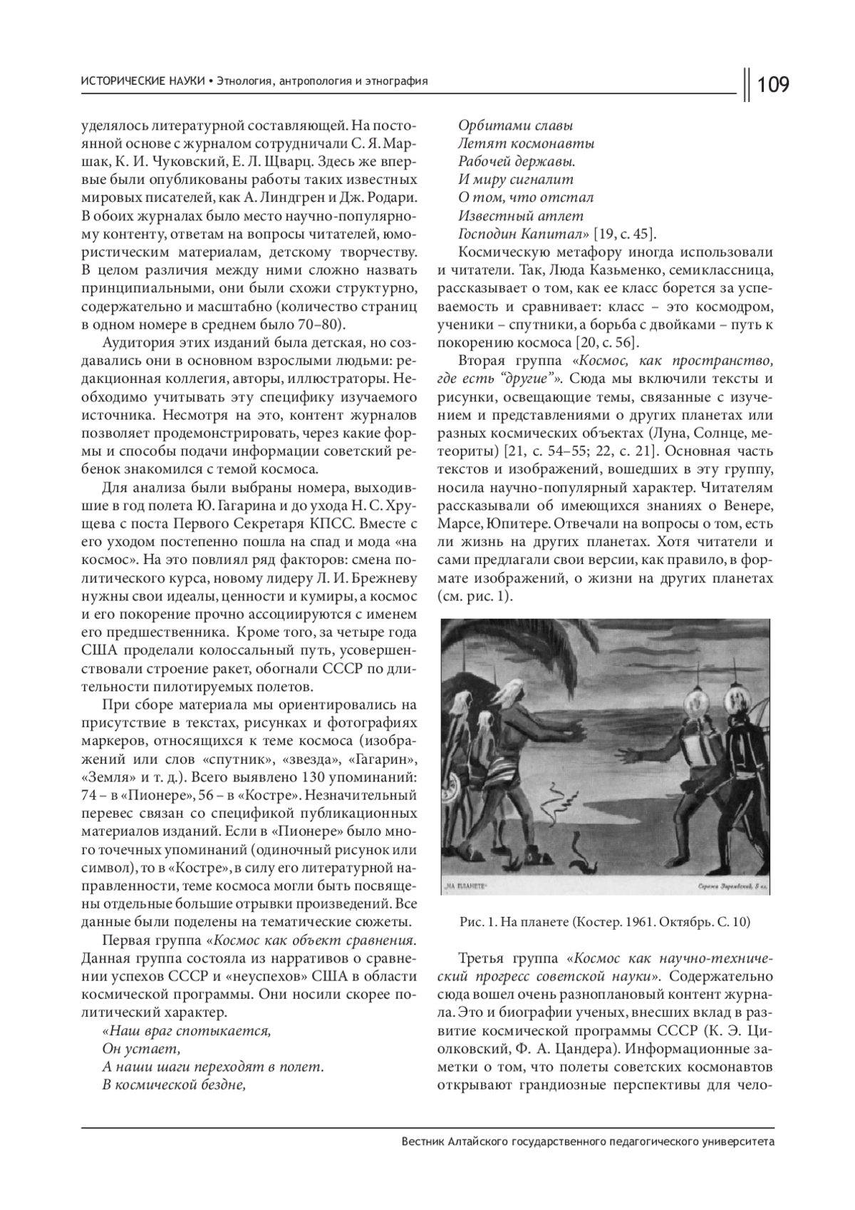 Цель данной статьи состоит в исследовании и выявлении наиболее популярных тематических сюжетов о космосе в пионерских журналах 60-х гг. Источниками послужили журналы «Пионер» и «Костер». Был применен визуально-антропологический метод, это связано со спецификой выявленных сюжетов, все они сопровождались яркими иллюстрациями. В результате полученные данные были систематизированы и проанализированы по ключевым направлениям: космос как объект сравнения, как пространство, где есть «другие», как научно-технический прогресс, как проект «будущего».