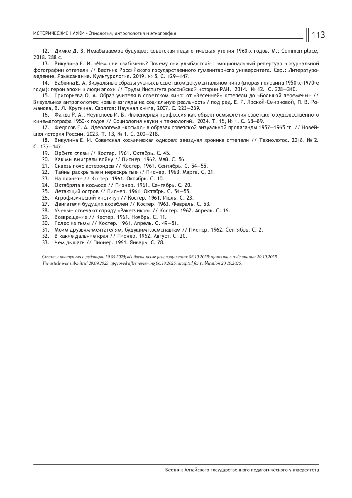 13. Викулина Е. И. “Чем они озабочены? Почему они улыбаются?”: эмоциональный репертуар в журнальной фотографии оттепели // Вестник Российского государственного гуманитарного университета. Сер.: Литературоведение. Языкознание. Культурология. 2019. № 5. С. 129-147.