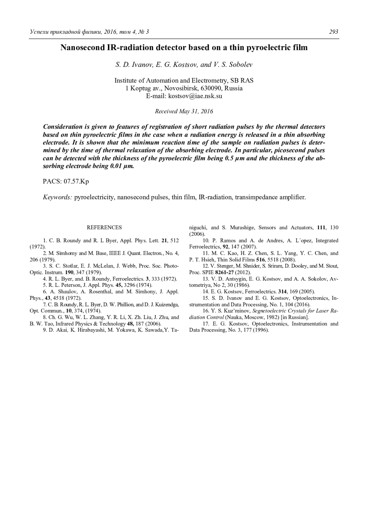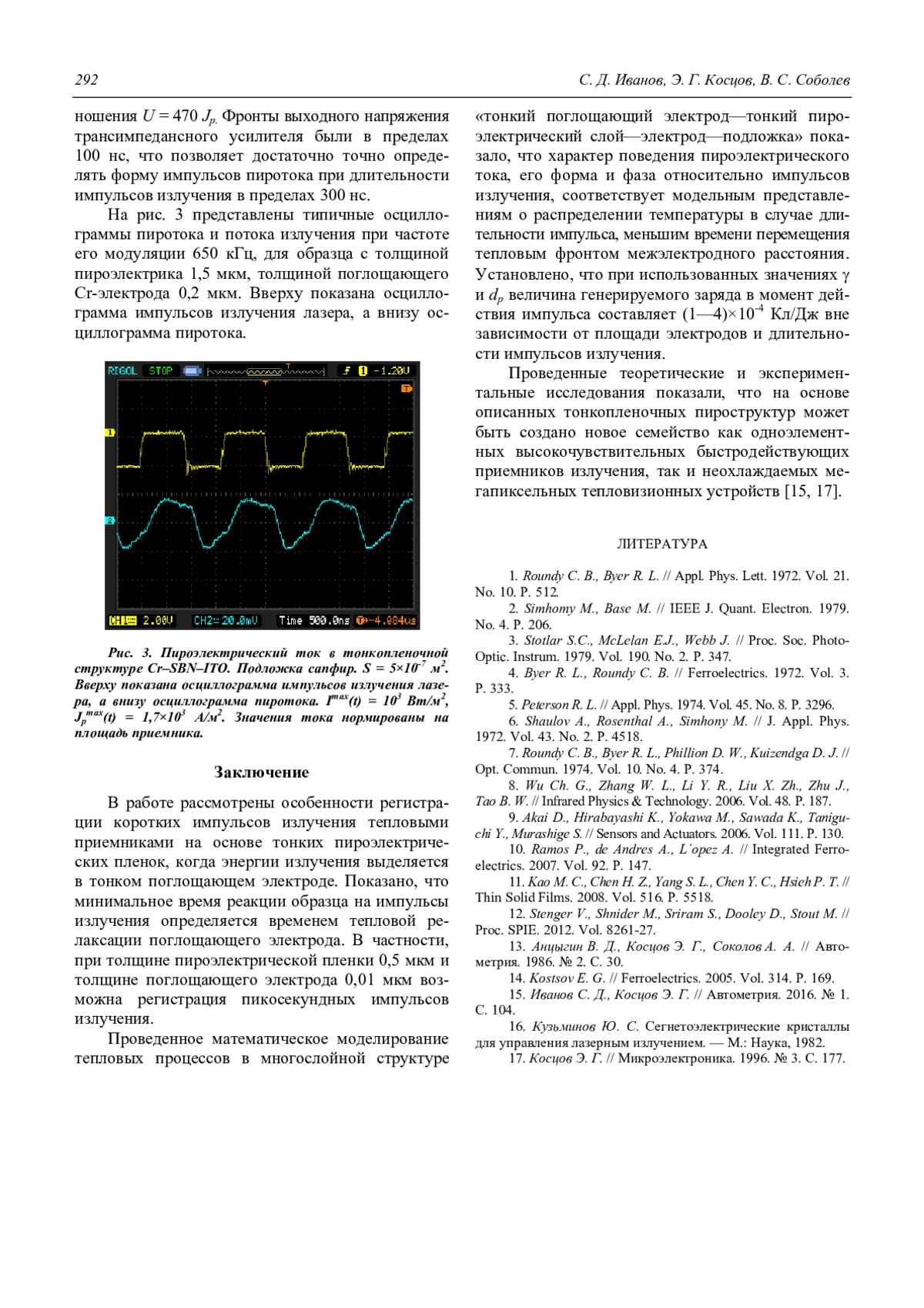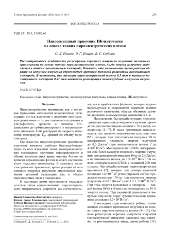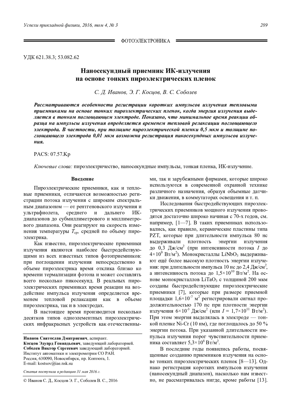 Иванов С. Д., Косцов Э. Г., Соболев В. С. Наносекундный приемник ИК-излучения на основе тонких пироэлектрических пленок 289