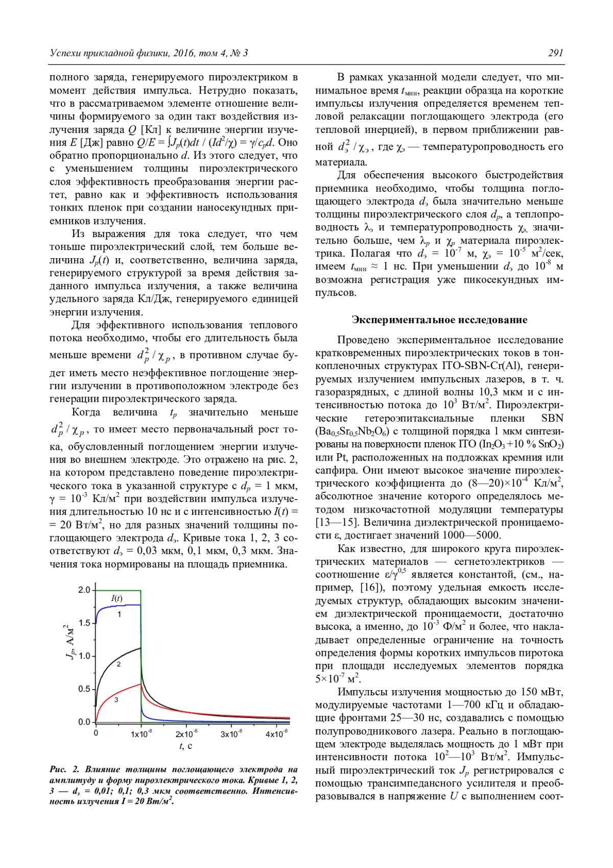 Проведенное математическое моделирование тепловых процессов в многослойной структуре «тонкий поглощающий электрод—тонкий пироэлектрический слой—электрод—подложка» показало, что характер поведения пироэлектрического тока, его форма и фаза относительно импульсов излучения, соответствует модельным представлениям о распределении температуры в случае длительности импульса, меньшим времени перемещения тепловым фронтом межэлектродного расстояния. Установлено, что при использованных значениях и dp величина генерируемого заряда в момент действия импульса составляет (1—4)×10-4 Кл/Дж вне зависимости от площади электродов и длительности импульсов излучения.