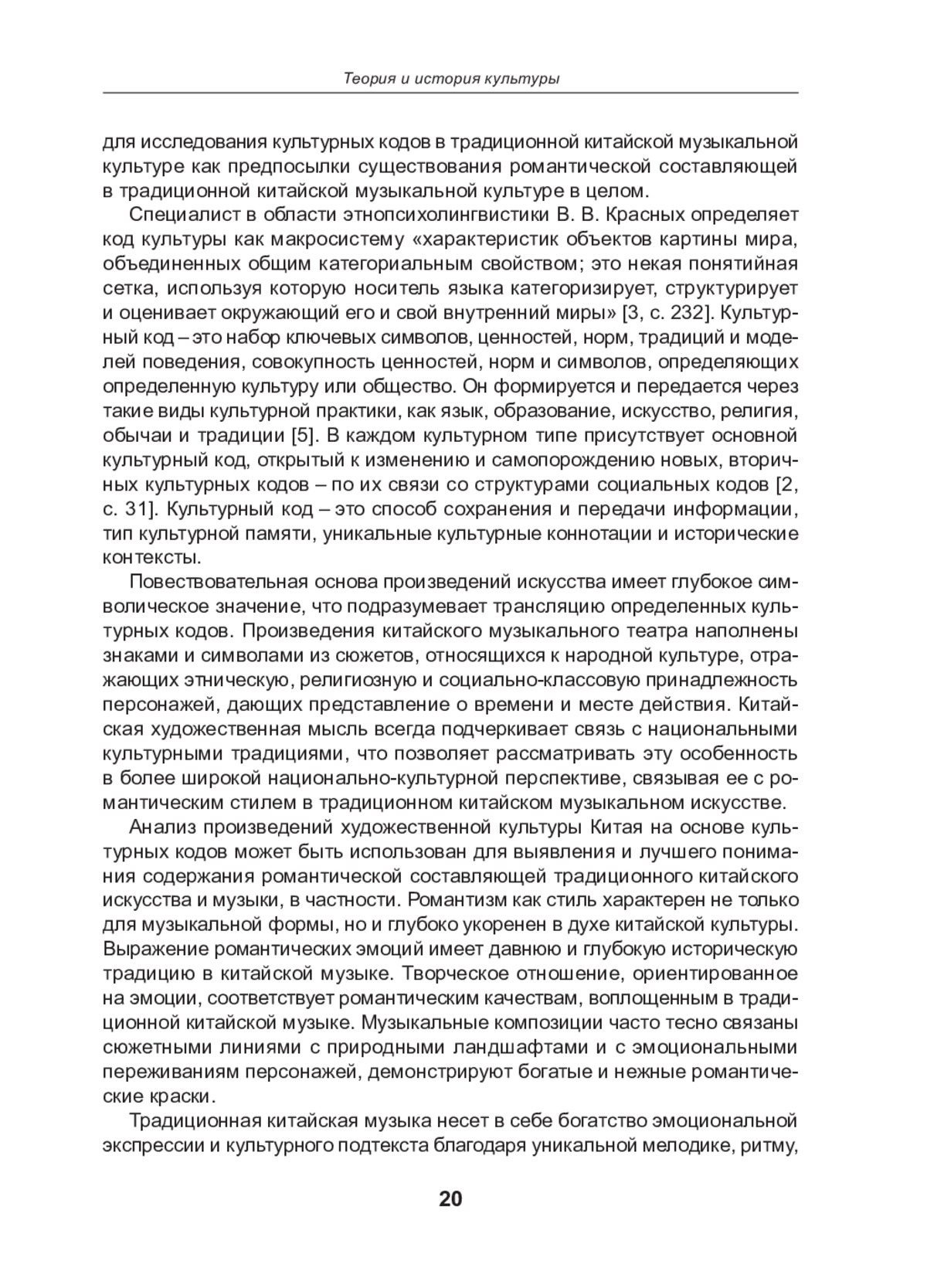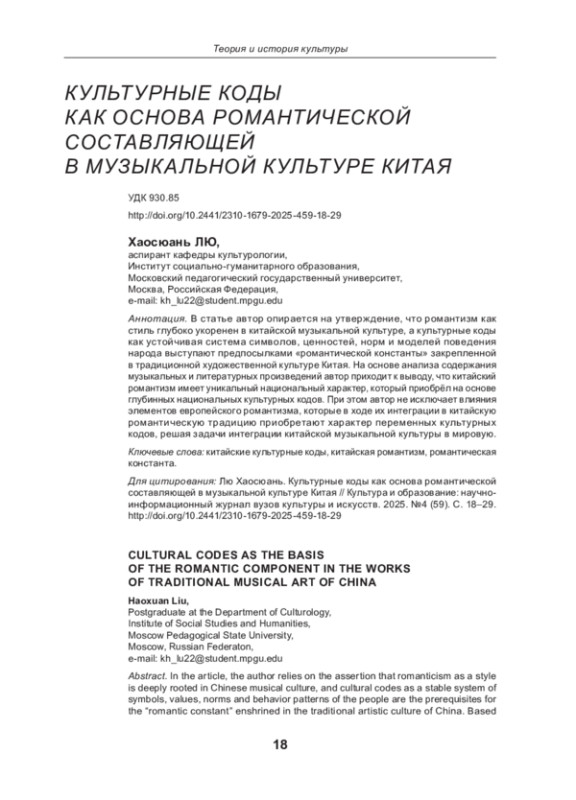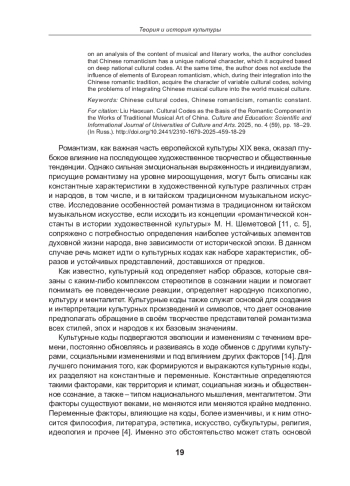 В статье автор опирается на утверждение, что романтизм как стиль глубоко укоренен в китайской музыкальной культуре, а культурные коды как устойчивая система символов, ценностей, норм и моделей поведения народа выступают предпосылками «романтической константы» закрепленной в традиционной художественной культуре Китая. На основе анализа содержания музыкальных и литературных произведений автор приходит к выводу, что китайский романтизм имеет уникальный национальный характер, который приобрёл на основе глубинных национальных культурных кодов. При этом автор не исключает влияния элементов европейского романтизма, которые в ходе их интеграции в китайскую романтическую традицию приобретают характер переменных культурных кодов, решая задачи интеграции китайской музыкальной культуры в мировую.