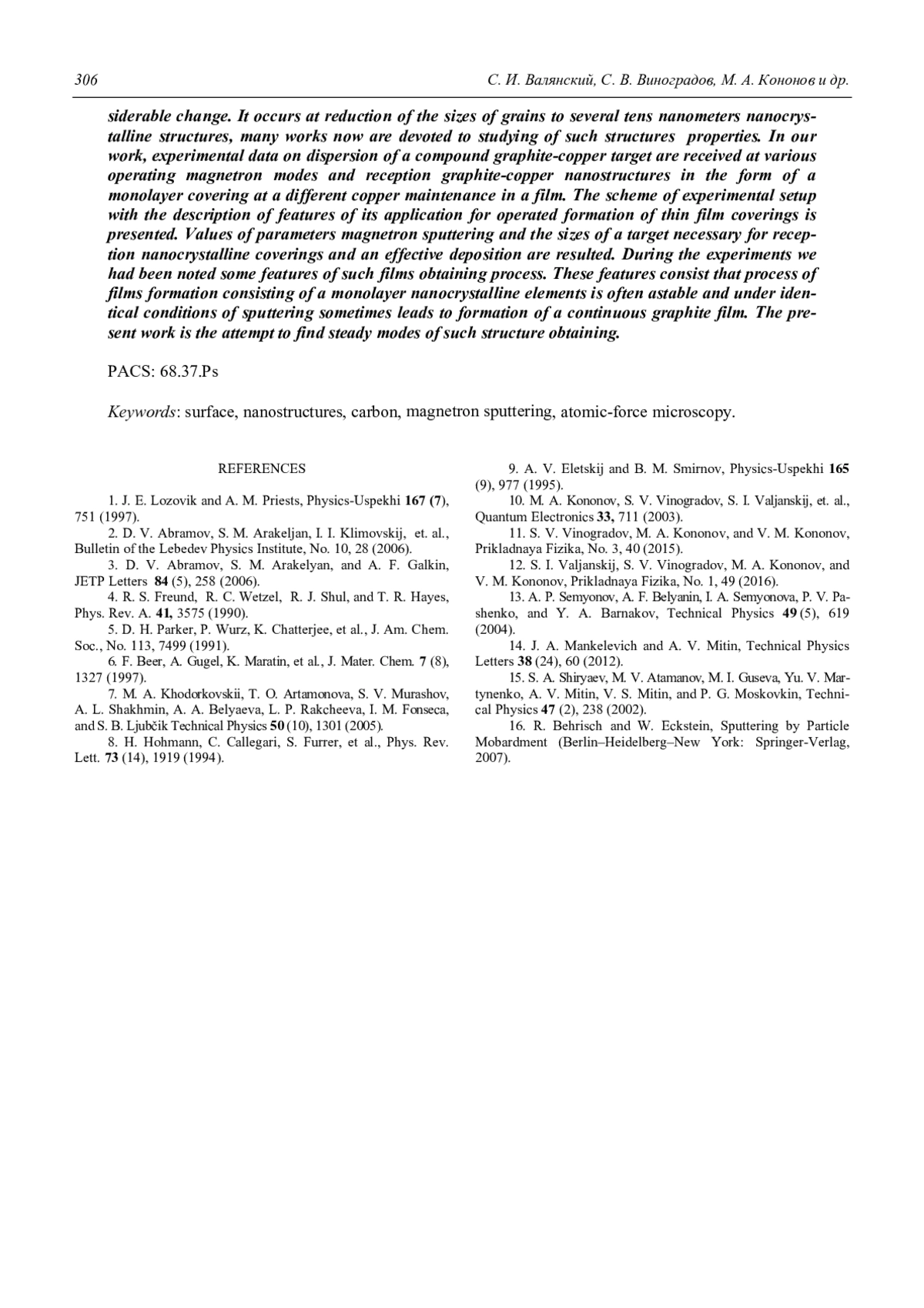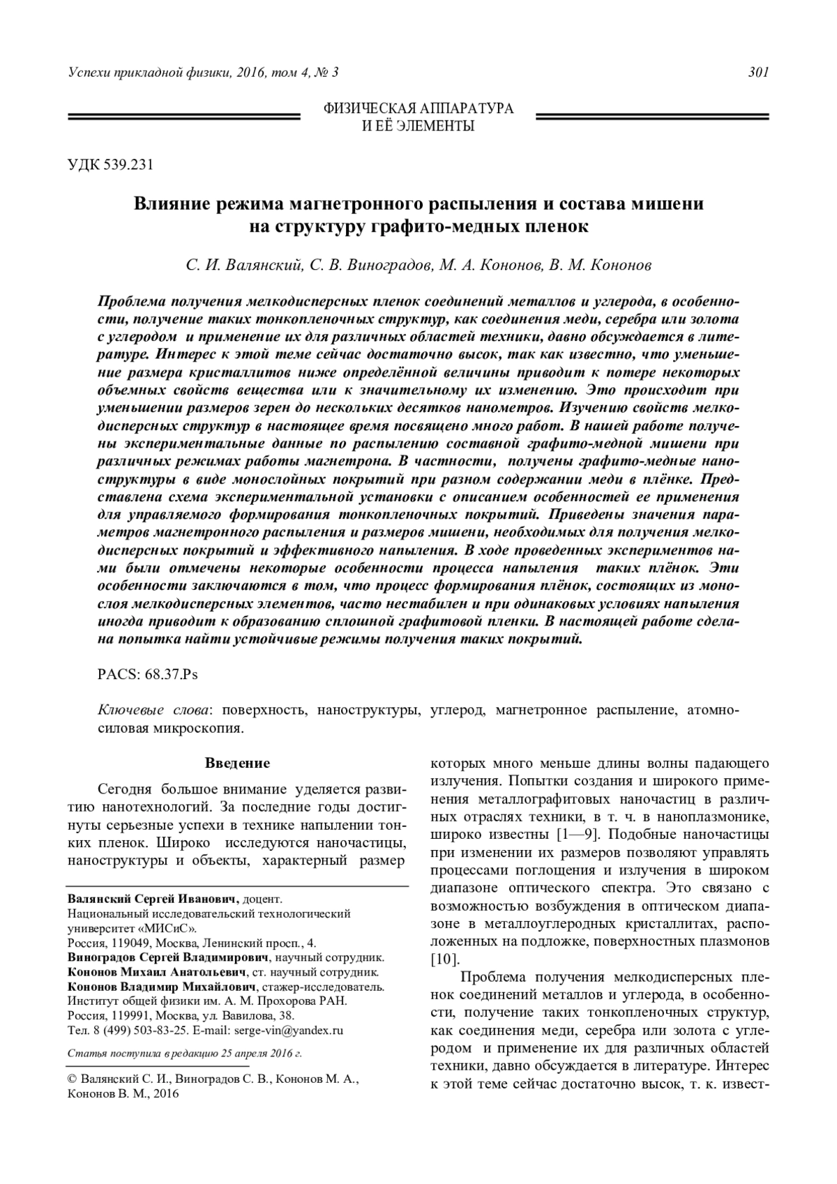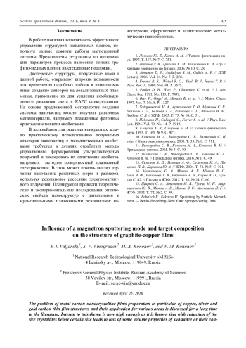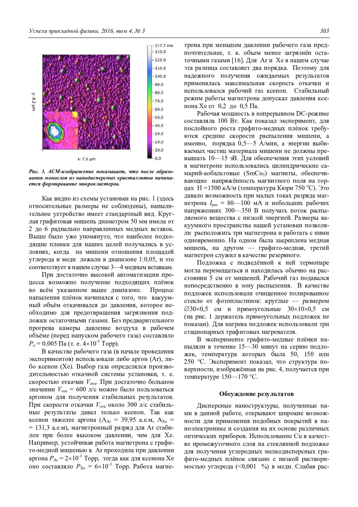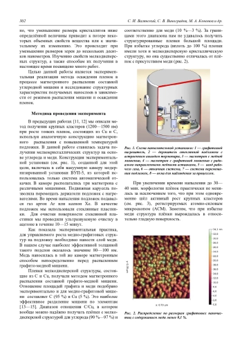Проблема получения мелкодисперсных пленок соединений металлов и углерода, в особенности, получение таких тонкопленочных структур, как соединения меди, серебра или золота с углеродом и применение их для различных областей техники, давно обсуждается в литературе. Интерес к этой теме сейчас достаточно высок, так как известно, что уменьшение размера кристаллитов ниже определённой величины приводит к потере некоторых объемных свойств вещества или к значительному их изменению. Это происходит при уменьшении размеров зерен до нескольких десятков нанометров. Изучению свойств мелкодисперсных структур в настоящее время посвящено много работ. В нашей работе получены экспериментальные данные по распылению составной графито-медной мишени при различных режимах работы магнетрона. В частности, получены графито-медные наноструктуры в виде монослойных покрытий при разном содержании меди в плёнке. Представлена схема экспериментальной установки с описанием особенностей ее применения для управляемого формирования тонкопленочных покрытий. Приведены значения параметров магнетронного распыления и размеров мишени, необходимых для получения мелкодисперсных покрытий и эффективного напыления. В ходе проведенных экспериментов нами были отмечены некоторые особенности процесса напыления таких плёнок. Эти особенности заключаются в том, что процесс формирования плёнок, состоящих из монослоя мелкодисперсных элементов, часто нестабилен и при одинаковых условиях напыления иногда приводит к образованию сплошной графитовой пленки. В настоящей работе сделана попытка найти устойчивые режимы получения таких покрытий.