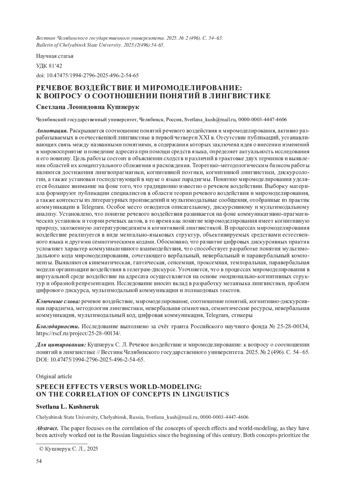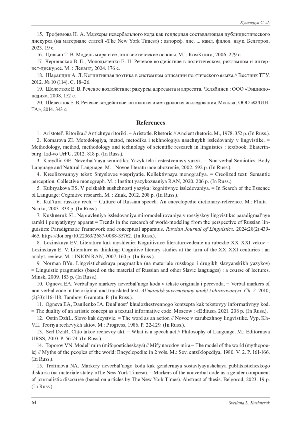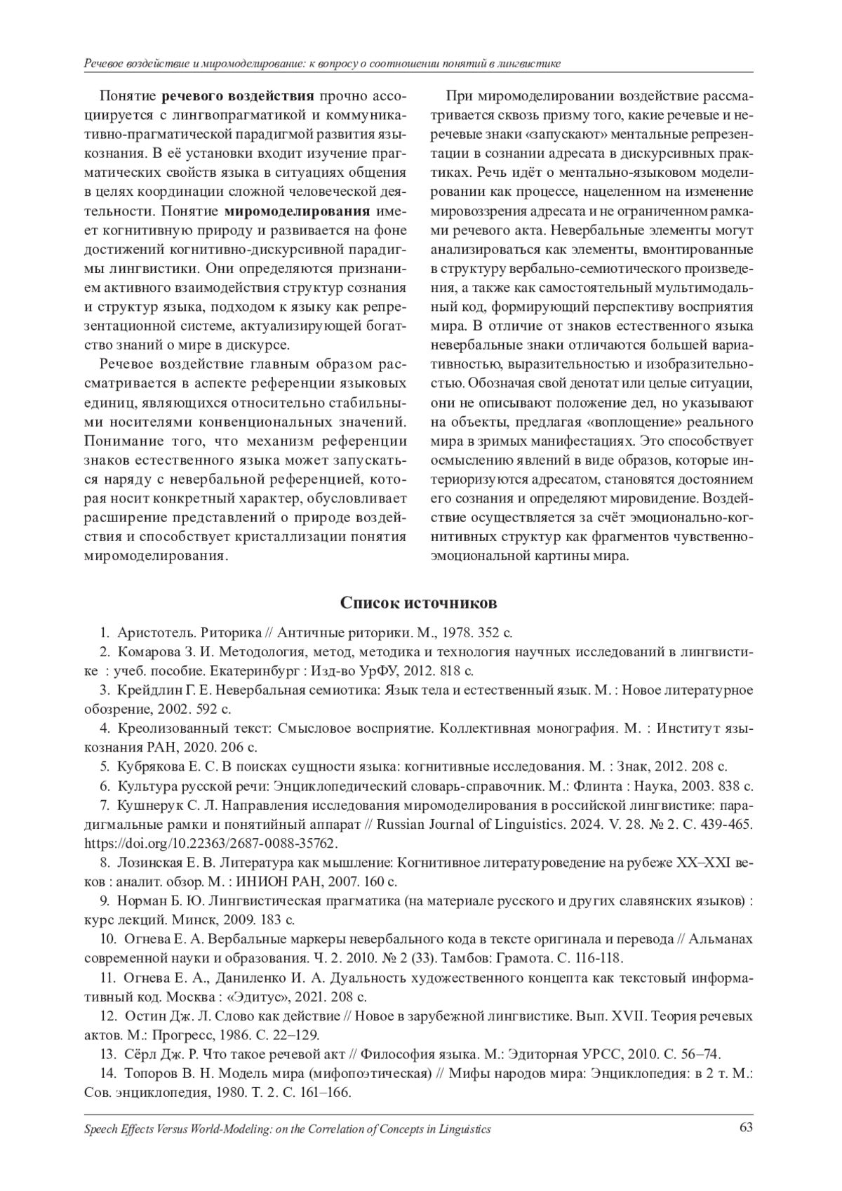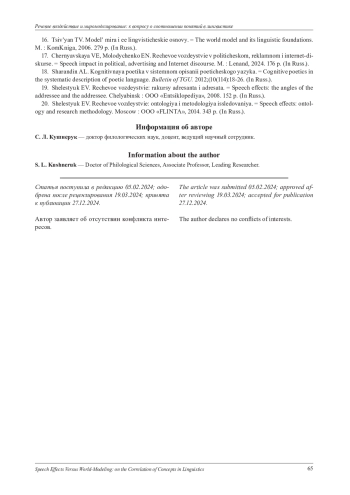 7. Кушнерук С. Л. Направления исследования миромоделирования в российской лингвистике: парадигмальные рамки и понятийный аппарат // Russian Journal of Linguistics. 2024. V. 28. № 2. С. 439-465. DOI: 10.22363/2687-0088-35762 EDN: DVZOQG