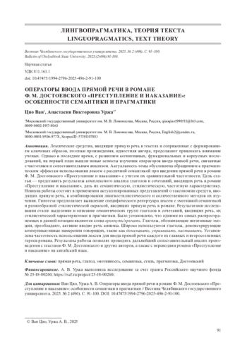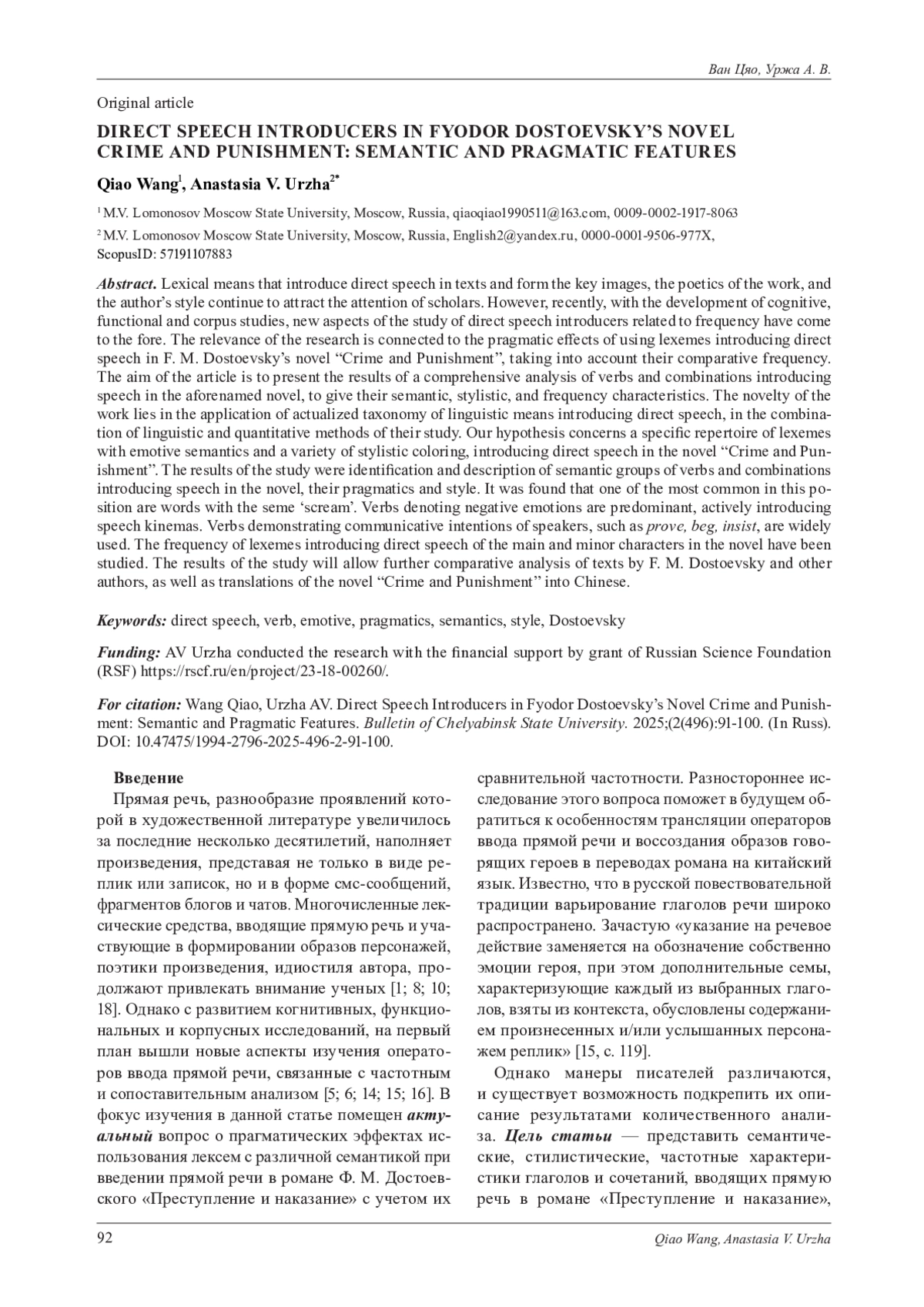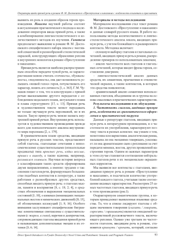 Лексические средства, вводящие прямую речь в текстах и сопряженные с формированием ключевых образов, поэтики произведения, идиостиля автора, продолжают привлекать внимание ученых. Однако в последнее время, с развитием когнитивных, функциональных и корпусных исследований, на первый план вышли новые аспекты изучения операторов ввода прямой речи, связанные с частотным и сопоставительным анализом. Актуальность темы обусловлена обращением к прагматическим эффектам использования лексем с различной семантикой при введении прямой речи в романе Ф. М. Достоевского «Преступление и наказание» с учетом их сравнительной частотности. Цель статьи - представить результаты комплексного анализа глаголов и сочетаний, вводящих речь в романе «Преступление и наказание», дать их семантическую, стилистическую, частотную характеристику. Новизна работы состоит в применении актуализированных представлений о таксономии средств, вводящих прямую речь, в комбинировании лингвостилистического и количественного методов их изучения. Гипотеза предполагает выявление специфического репертуара лексем с эмотивной семантикой и разнообразной стилистической окраской, вводящих прямую речь в романе. Результатами исследования стали: выделение и описание семантических групп глаголов и сочетаний, вводящих речь, их стилистической характеристики и прагматики. Было установлено, что одними из самых распространенных в данной позиции являются слова крикнуть/кричать. Глаголы, обозначающие негативные эмоции, преобладают, активно вводят речь кинемы. Широко используются глаголы, демонстрирующие коммуникативные намерения говорящих, такие как доказывать, упрашивать, настаивать. Установлена частотность использования лексем для ввода прямой речи каждого из главных и второстепенных героев романа. Результаты работы позволят проводить дальнейший сопоставительный анализ произведения с текстами Ф. М. Достоевского и других авторов, а также с переводами романа «Преступление и наказание» на китайский язык.
