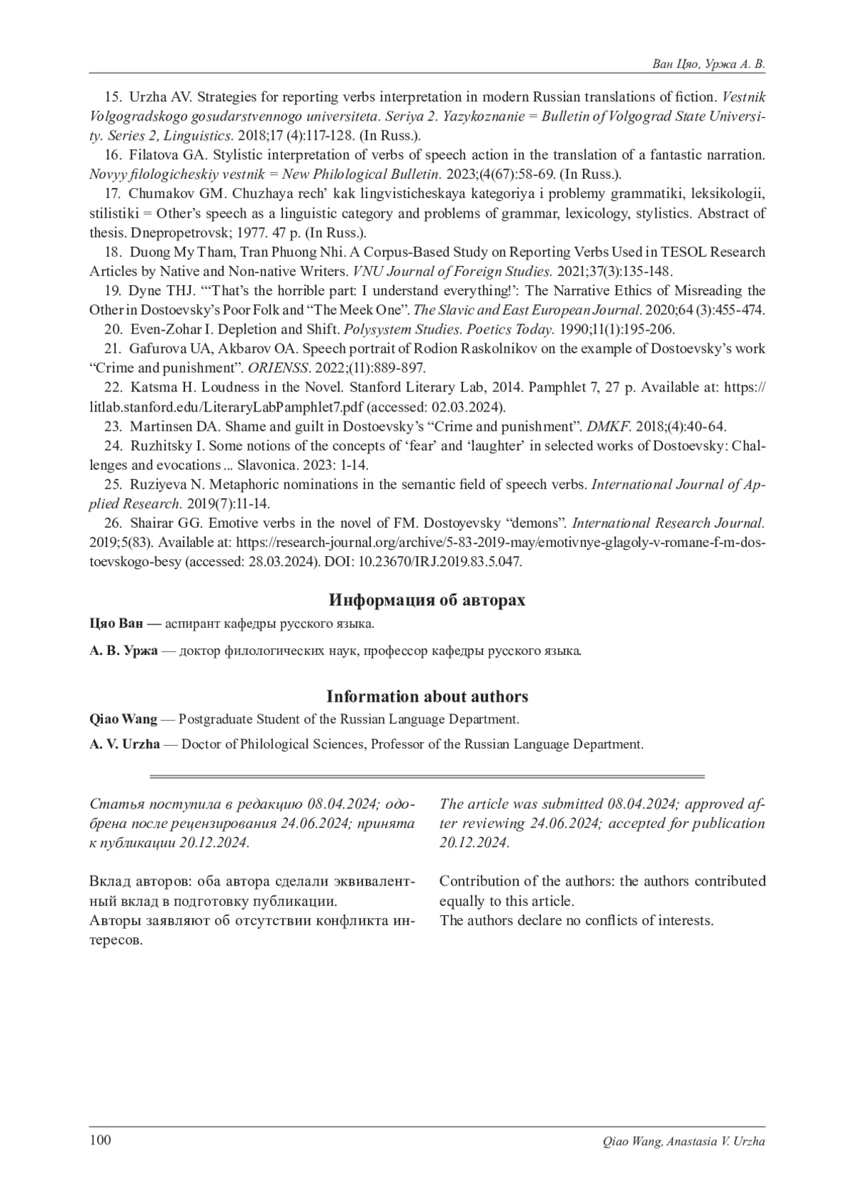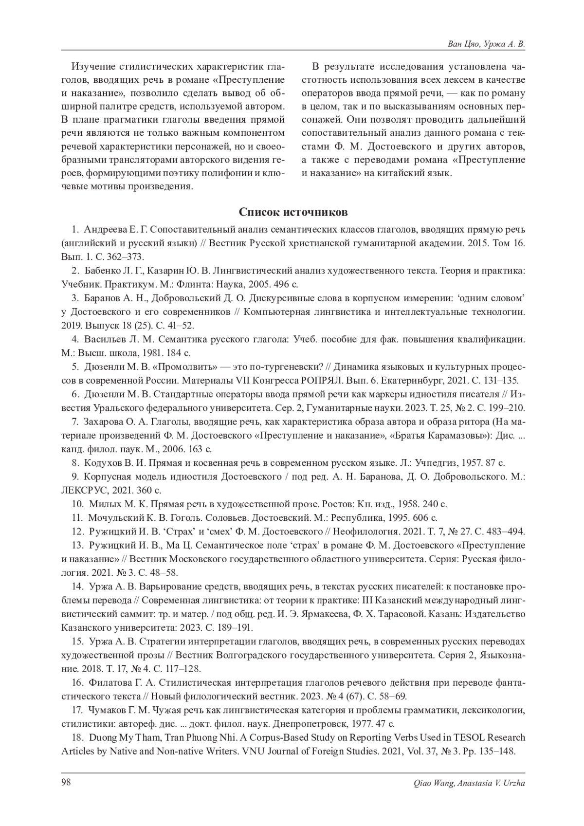 15. Уржа А. В. Стратегии интерпретации глаголов, вводящих речь, в современных русских переводах художественной прозы // Вестник Волгоградского государственного университета. Серия 2, Языкознание. 2018. Т. 17, № 4. С. 117-128. EDN: VRCNII