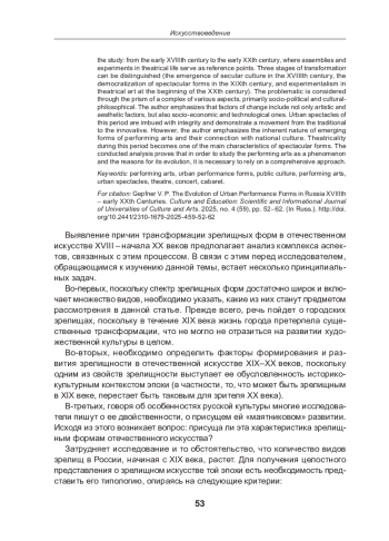 В статье анализируется публичная культура России, активное формирование которой начинается с преобразований Петра I. Это определило и хронологический диапазон исследования: с начала XVIII века до начала ХХ века, где своего рода опорными точками выступают ассамблеи и эксперименты в театральной жизни и можно выделить три этапа трансформации (зарождение светской культуры в XVIII веке, демократизация зрелищных форм в XIX веке, экспериментальность в театральном искусстве начала XX века). Проблематика рассматривается через призму комплекса различных аспектов, прежде всего, социально политического и культурфилософского. Автор подчеркивает, что факторами изменений выступают не только художественно эстетические, но и социально экономические и технологические факторы. Городские зрелища этого периода наделены целостностью и демонстрируют движение от традиционного к инновационному. Однако автор подчеркивает почвенность возникающих форм зрелищного искусства, связь с национальной культурой. Театральность в этот период становится одной из главных характеристик зрелищных форм. Проведенный анализ доказывает, что для изучения зрелищного искусства как феномена и причин его эволюции необходимо опираться на комплексный подход.