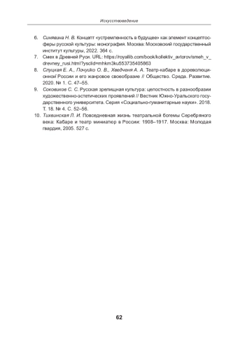 8. Слуцкая Е. А., Почуико О. В., Хведченя А. А. Театр кабаре в дореволюционной России и его жанровое своеобразие // Общество. Среда. Развитие. 2020. № 1. С. 47-55. EDN: QEBONS