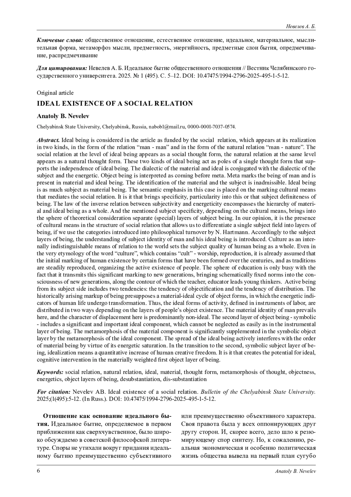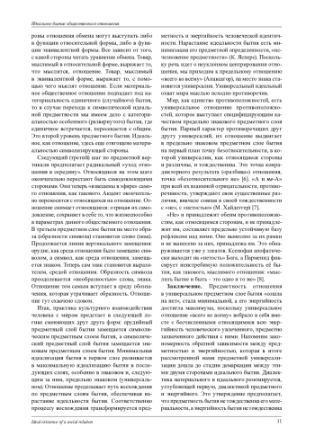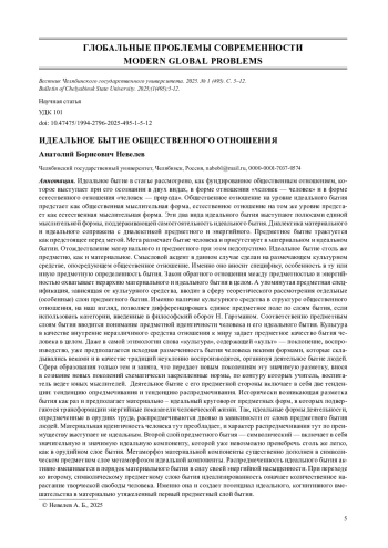 Идеальное бытие в статье рассмотрено, как фундированное общественным отношением, которое выступает при его осознании в двух видах, в форме отношения «человек - человек» и в форме естественного отношения «человек - природа». Общественное отношение на уровне идеального бытия предстает как общественная мыслительная форма, естественное отношение на том же уровне предстает как естественная мыслительная форма. Эти два вида идеального бытия выступают полюсами единой мыслительной формы, поддерживающей самостоятельность идеального бытия. Диалектика материального и идеального сопряжена с диалектикой предметного и энергийного. Предметное бытие трактуется как предстоящее перед метой. Мета размечает бытие человека и присутствует в материальном и идеальном бытии. Отождествление материального и предметного при этом недопустимо. Идеальное бытие столь же предметно, как и материальное. Смысловой акцент в данном случае сделан на размечающем культурном средстве, опосредующем общественное отношение. Именно оно вносит специфику, особенность в ту или иную предметную определенность бытия. Закон обратного отношения между предметностью и энергийностью охватывает иерархию материального и идеального бытия в целом. А упомянутая предметная спецификация, зависящая от культурного средства, вводит в сферу теоретического рассмотрения отдельные (особенные) слои предметного бытия. Именно наличие культурного средства в структуре общественного отношения, на наш взгляд, позволяет дифференцировать единое предметное поле по слоям бытия, если использовать категории, введенные в философский оборот Н. Гартманом. Соответственно предметным слоям бытия вводится понимание предметной идентичности человека и его идеального бытия. Культура в качестве внутренне неразличимого средства отношения к миру задает предметное качество бытия человека в целом. Даже в самой этимологии слова «культура», содержащей «культ» - поклонение, воспроизводство, уже предполагается исходная размеченность бытия человека некими формами, которые складывались веками и в качестве традиций неуклонно воспроизводятся, организуя деятельное бытие людей. Сфера образования только тем и занята, что передает новым поколениям эту значимую разметку, внося в сознание новых поколений схематически закрепленные нормы, по контуру которых учитель, воспитатель ведет юных мыслителей. Деятельное бытие с его предметной стороны включает в себя две тенденции: тенденцию опредмечивания и тенденцию распредмечивания. Исторически возникающая разметка бытия как раз и предполагает материально - идеальный круговорот предметных форм, в которых подвергаются трансформации энергийные показатели человеческой жизни. Так, идеальные формы деятельности, опредмеченные в орудиях труда, распредмечиваются двояко в зависимости от слоев предметного бытия людей. Материальная идентичность человека тут преобладает, и характер распредмечивания тут по преимуществу выступает не идеальным. Второй слой предметного бытия - символический - включает в себя значительную и значиму ю идеальную компоненту, которой уже невозможно пренебречь столь же легко, как в орудийном слое бытия. Метаморфоз материальной компоненты существенно дополнен в символическом предметном слое метаморфозом идеальной компоненты. Распр