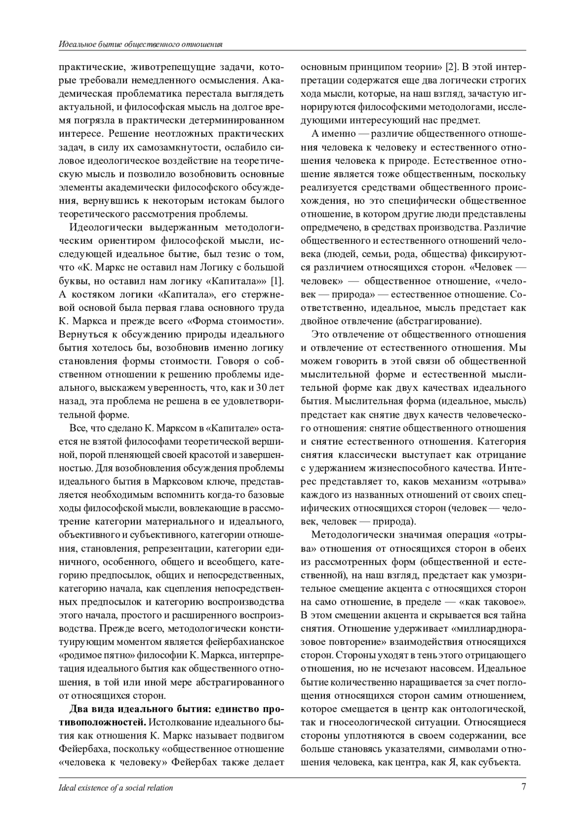 Идеологически выдержанным методологическим ориентиром философской мысли, исследующей идеальное бытие, был тезис о том, что «К. Маркс не оставил нам Логику с большой буквы, но оставил нам логику «Капитала»» [1]. А костяком логики «Капитала», его стержневой основой была первая глава основного труда К. Маркса и прежде всего «Форма стоимости». Вернуться к обсуждению природы идеального бытия хотелось бы, возобновив именно логику становления формы стоимости. Говоря о собственном отношении к решению проблемы идеального, выскажем уверенность, что, как и 30 лет назад, эта проблема не решена в ее удовлетворительной форме.