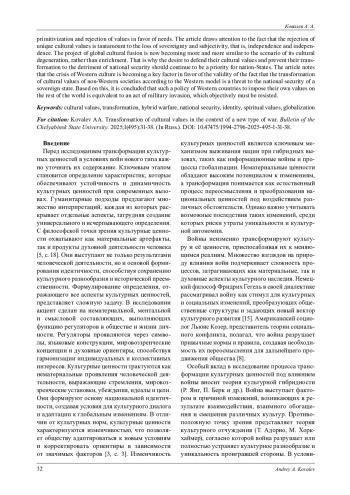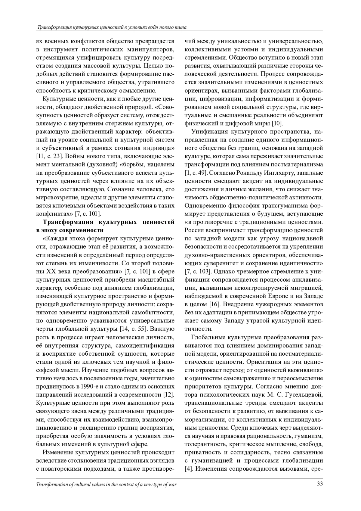 Статья посвящена изучению культурных ценностей, для которых трансформация является естественным процессом изменения и развития, в условиях войн нового поколения. Даются определения основных категорий, среди которых культурные ценности, трансформация культурных ценностей, а также война нового типа. В исследовании рассматриваются некоторые теории и подходы, которые раскрывают взаимосвязь войны и процесса трансформации культурных ценностей. При этом нетрадиционные войны, имеющие гибридный (смешанный) характер, являются особым типом войны как социально-политического явления, которые стремятся не только к физическому подавлению или захвату, но и к духовному порабощению. В новых войнах противник не стремится превзойти противоположную сторону в силе духа или собственных моральных принципах. Напротив, основная цель - способствовать культурной деградации соперника, его примитивизации и отказу от ценностей в пользу потребностей. В статье обращается внимание на то, что отказ от уникальных культурных ценностей равносилен потере суверенности и субъектности, то есть самостоятельности и независимости. Проект глобального слияния культур в настоящее время все более становится похож на сценарий его культурного вырождения, а не обогащения. Именно поэтому для национальных государств по-прежнему должно оставаться в приоритете стремление к отстаиванию своих культурных ценностей и недопущению их трансформации во вред национальной безопасности. В статье отмечается, что кризис западной культуры становится ключевым фактором в пользу обоснованности того обстоятельства, что трансформация культурных ценностей не западных обществ по западному образцу является угрозой национальной безопасности суверенного государства. На основании этого делается вывод, что такая политика стран Запада по навязыванию собственных ценностей остальному миру приравнивается к акту военного вторжения, которому объективно необходимо сопротивляться.