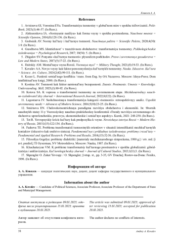 1. Авцинова Г. И., Воронина Е. Ю. Трансформация ценностей в глобальном мире в эпоху цифровизации // PolitBook. 2023. № 1. С. 46-57. EDN: RQXUTV