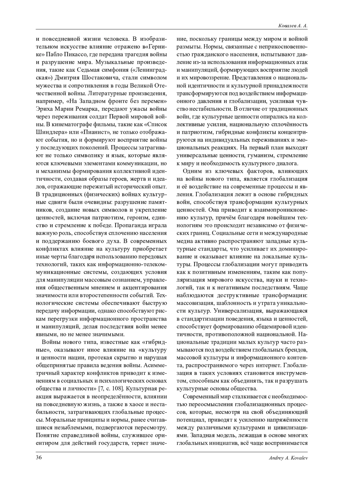 7. Ковалев А. А. Новые войны как фактор переосмысления культурных ценностей // Наука. Искусство. Культура. 2024. № 2 (42). С. 99-111. EDN: ARVJJS