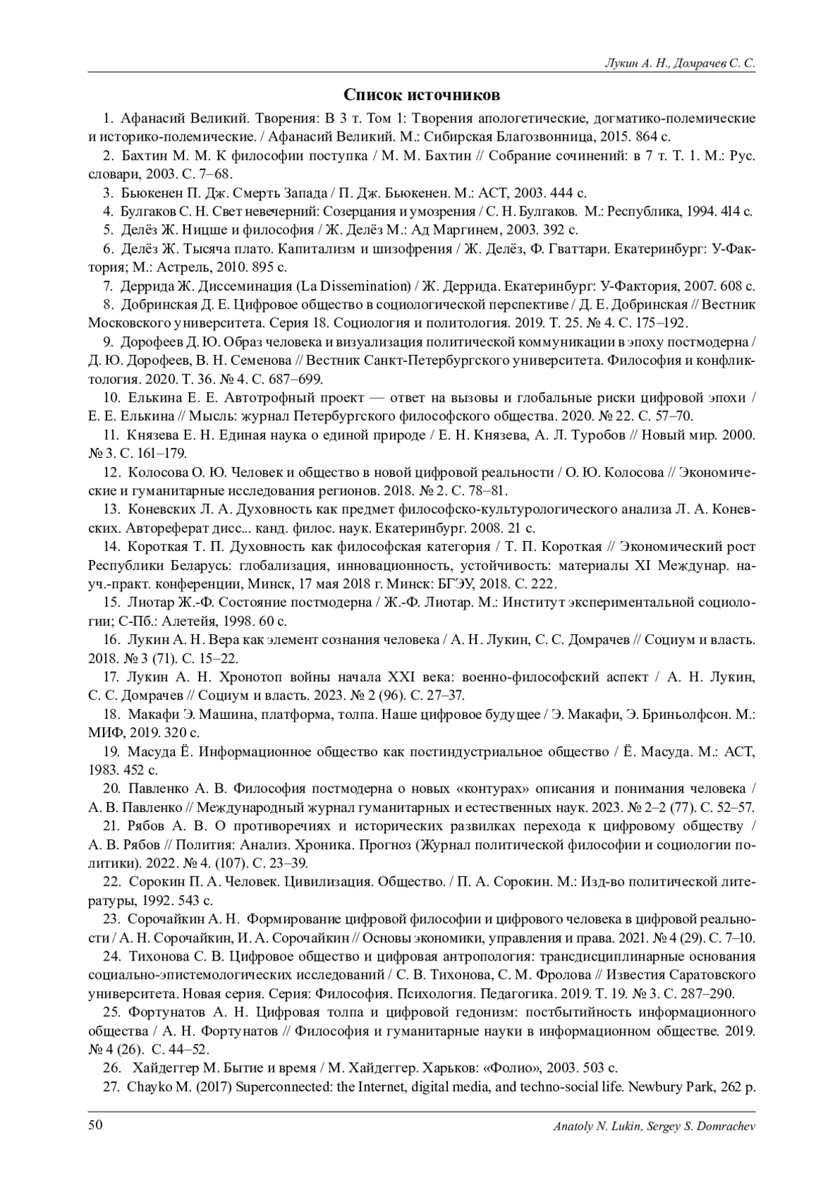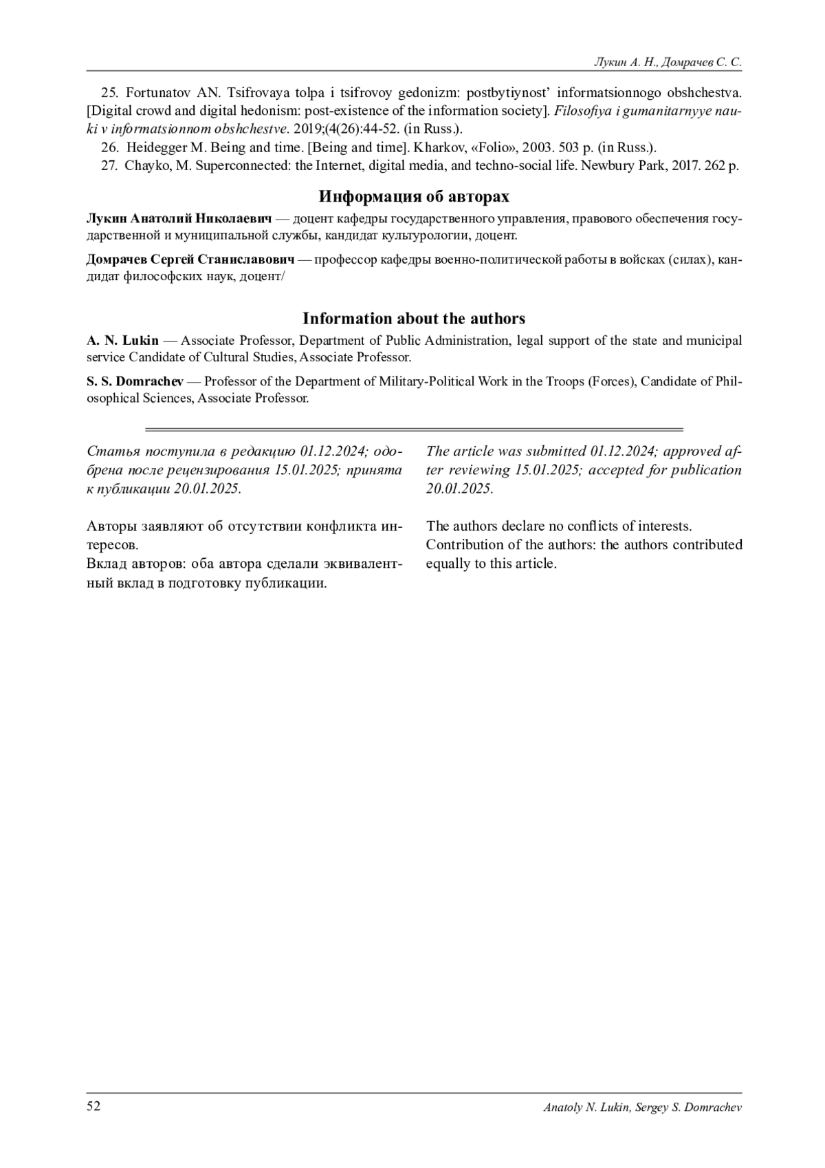 25. Фортунатов А. Н. Цифровая толпа и цифровой гедонизм: постбытийность информационного общества / А. Н. Фортунатов // Философия и гуманитарные науки в информационном обществе. 2019. № 4 (26). С. 44-52. EDN: NKJXOH