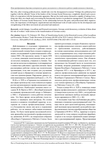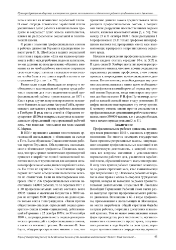 В статье на основе публикаций в немецкой социал-демократической прессе 60-80 гг. XIX в. и документальных материалов по истории рабочего движения, включая, переписку классиков марксизма с соратниками по партии, показана эволюция идеологических воззрений лидеров лассальянского и эйзенахского рабочего профессионального движения и вождей германской социал-демократии на роль рабочих профсоюзов в преобразовании капиталистического общества. Истоки рабочего движения в Германии можно найти в 40-е гг. XIX в., когда в 1844 г. в Берлине было основано «Центральное общество для увеличения благосостояния рабочих классов». Было издано воззвание ко всем сочувствующим трудящемуся населению, и даже король Фридрих-Вильгельм IV именным рескриптом предложил 15000 талеров для улучшения материального и нравственного положения ремесленников и фабричных рабочих. Начинание это было встречено бюрократией недоверчиво, устав был утвержден королем только в 1848 г., из обещанной королем суммы правительство передало только половину [4, с. 11]. В Германии до 1848 г. не существовало организованного рабочего политического и профсоюзного движения. Они были запрещены вплоть до революции 1848 г. Существовали разрозненные рабочие организации социальной самопомощи в виде страховых касс, касс взаимопомощи при погребении и др. В августе-сентябре 1848 г. под влиянием революционных событий на съезде в Берлине под руководством печатника Стефана Борна была создана самостоятельная рабочая организация «Всеобщее немецкое рабочее братство», в создании которой участвовали представители 32 рабочих союзов со всей Германии. Вскоре в ее составе насчитывалось 230 районных организаций и местных союзов, объединивших подмастерьев и квалифицированных рабочих, в основе деятельности которых лежал принцип самопомощи [10, с. 33,34]. Однако поле деятельности профсоюзов не ограничивается принципом профессиональной солидарности и взаимопомощи. Не менее важная миссия отводится просветительской деятельности среди рабочих как идеологическая стратегия подготовки непримиримой классовой борьбы. В дискурсе политических установок немецкой социал-демократии именно просвещение показывает трудящемуся, что капиталистический процесс производства низводит его рабочую силу до положения товара, определяемого законом спроса и предложения с тенденцией ухудшения его экономического положения. Единство действий важно не только для экономической борьбы, но и для политического освобождения рабочего класса. Важная задача, стоявшая перед профсоюзами в Германии, состояла в преодолении раскола среди рабочих. А. Бебель видел в раздробленности пролетариев главную причину недостаточного роста численности немецких профсоюзов и считал профсоюзы средством сознательного объединения трудящихся. Именно профсоюзы рассматривались как школа по формированию классового сознания, где осваиваются эффективные социальные практики борьбы с властью капитала, что делает рабочих социалистами. В статье акцентируется внимание на тезисе идеологов немецкой социал-демократии о том, что профсоюзы помогают разрушению умирающего капитализма и являются «зародышевыми клетками нового общества» (К. Гильман), где организация рабочих будет служить основой хозяйственного построения справедливой общественной системы. Вовлекаясь в