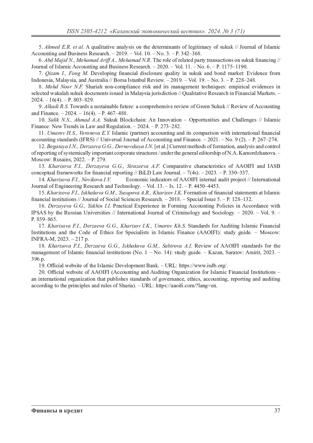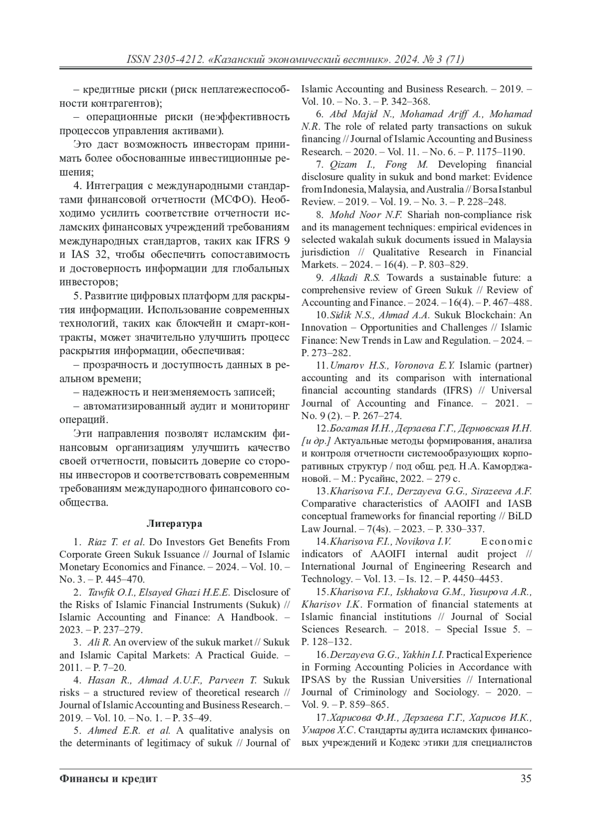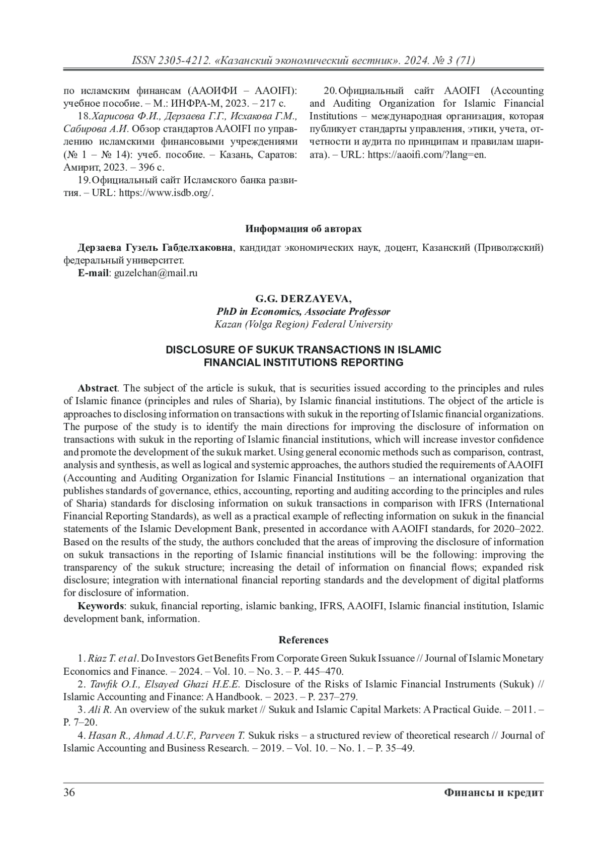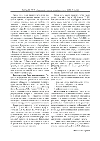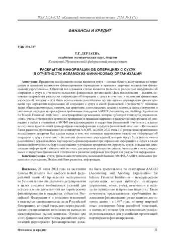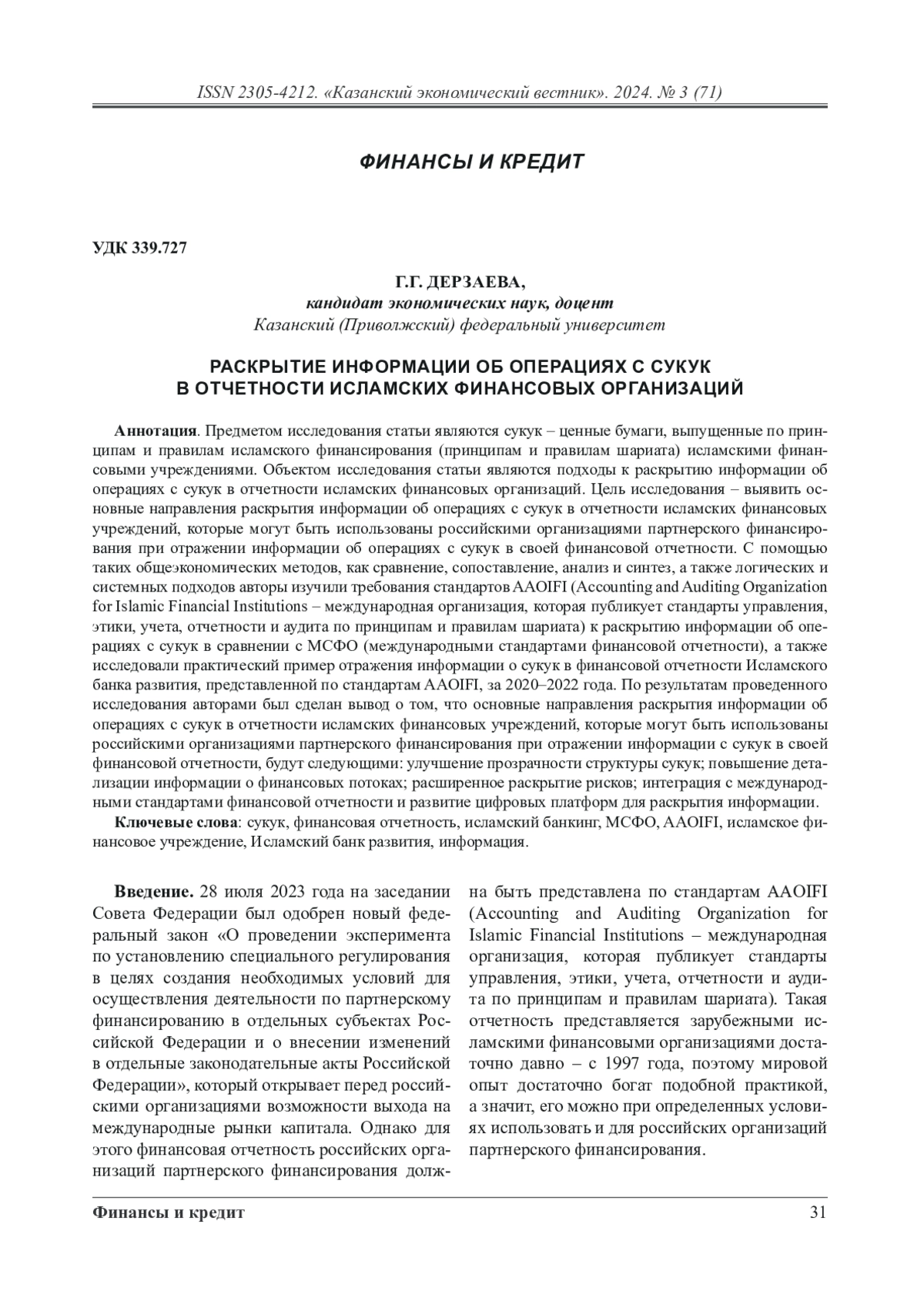Предметом исследования статьи являются сукук – ценные бумаги, выпущенные по принципам и правилам исламского финансирования (принципам и правилам шариата) исламскими финансовыми учреждениями. Oбъектом исследования статьи являются подходы к раскрытию информации об операциях с сукук в отчетности исламских финансовых организаций. Цель исследования – выявить основные направления раскрытия информации об операциях с сукук в отчетности исламских финансовых учреждений, которые могут быть использованы российскими организациями партнерского финансирования при отражении информации об операциях с сукук в своей финансовой отчетности. C помощью таких общеэкономических методов, как сравнение, сопоставление, анализ и синтез, а также логических и системных подходов авторы изучили требования стандартов AAOIFI (Accounting and Auditing Organization for Islamic Financial Institutions – международная организация, которая публикует стандарты управления, этики, учета, отчетности и аудита по принципам и правилам шариата) к раскрытию информации об операциях с сукук в сравнении с MCФO (международными стандартами финансовой отчетности), а также исследовали практический пример отражения информации о сукук в финансовой отчетности Исламского банка развития, представленной по стандартам AAOIFI, за 2020–2022 года. По результатам проведенного исследования авторами был сделан вывод о том, что основные направления раскрытия информации об операциях с сукук в отчетности исламских финансовых учреждений, которые могут быть использованы российскими организациями партнерского финансирования при отражении информации с сукук в своей финансовой отчетности, будут следующими: улучшение прозрачности структуры сукук; повышение детализации информации о финансовых потоках; расширенное раскрытие рисков; интеграция с международными стандартами финансовой отчетности и развитие цифровых платформ для раскрытия информации.