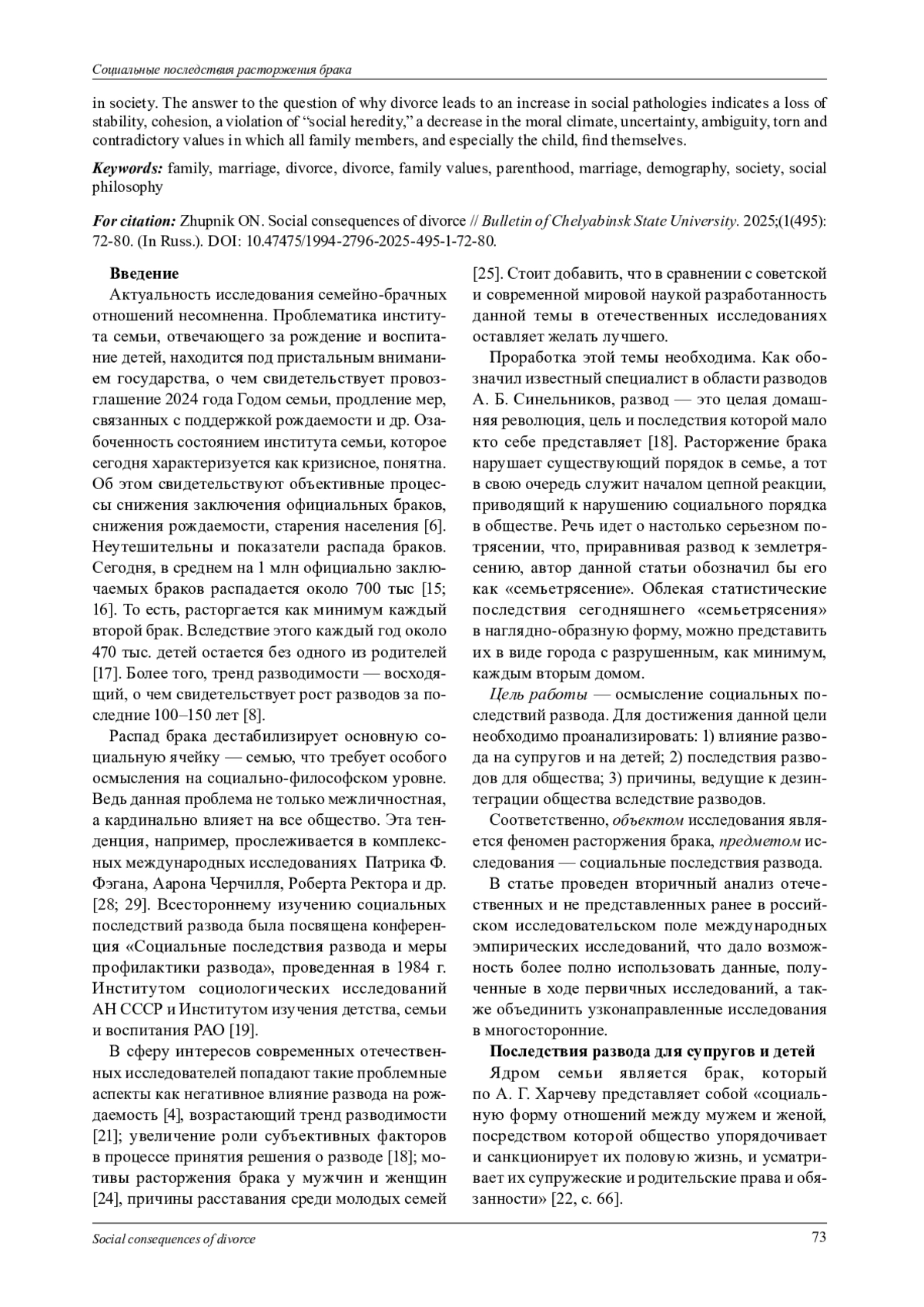 18. Синельников А. Б. Социальная приемлемость объективных и субъективных причин для развода в современной России // Социологические исследования. 2023. № 4. C. 75-83. DOI: 10.31857/S013216250022703-6 EDN: MOHTBK