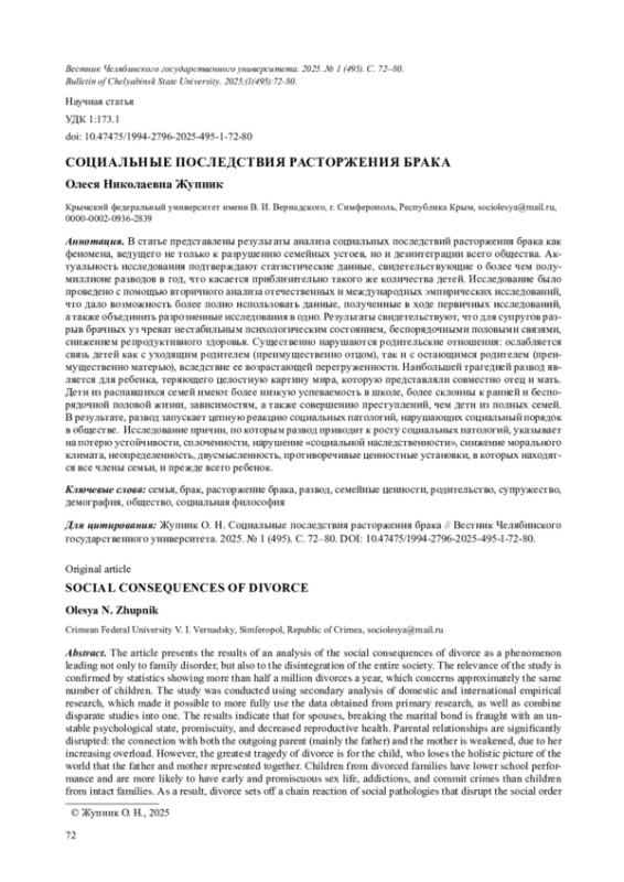 В статье представлены результаты анализа социальных последствий расторжения брака как феномена, ведущего не только к разрушению семейных устоев, но и дезинтеграции всего общества. Актуальность исследования подтверждают статистические данные, свидетельствующие о более чем полумиллионе разводов в год, что касается приблизительно такого же количества детей. Исследование было проведено с помощью вторичного анализа отечественных и между народных эмпирических исследований, что дало возможность более полно использовать данные, полученные в ходе первичных исследований, а также объединить разрозненные исследования в одно. Результаты свидетельствуют, что для супругов разрыв брачных уз чреват нестабильным психологическим состоянием, беспорядочными половыми связями, снижением репродуктивного здоровья. Существенно нарушаются родительские отношения: ослабляется связь детей как с уходящим родителем (преимущественно отцом), так и c остающимся родителем (преимущественно матерью), вследствие ее возрастающей перегруженности. Наибольшей трагедией развод является для ребенка, теряющего целостную картину мира, которую представляли совместно отец и мать. Дети из распавшихся семей имеют более низкую успеваемость в школе, более склонны к ранней и беспорядочной половой жизни, зависимостям, а также совершению преступлений, чем дети из полных семей. В результате, развод запускает цепную реакцию социальных патологий, нарушающих социальный порядок в обществе. Исследование причин, по которым развод приводит к росту социальных патологий, указывает на потерю устойчивости, сплоченности, нарушение «социальной наследственности», снижение морального климата, неопределенность, двусмысленность, противоречивые ценностные установки, в которых находятся все члены семьи, и прежде всего ребенок.