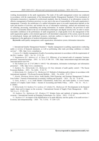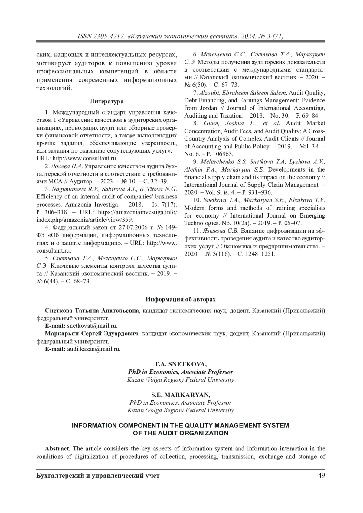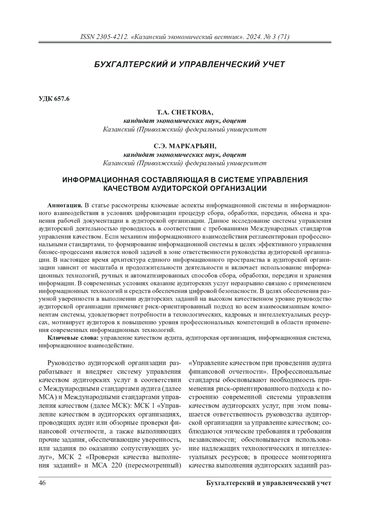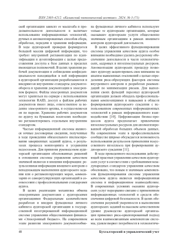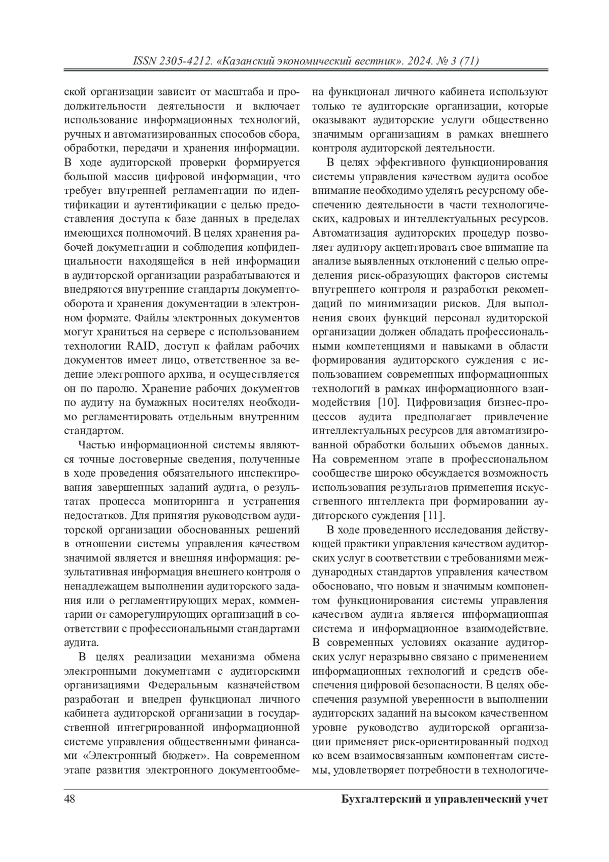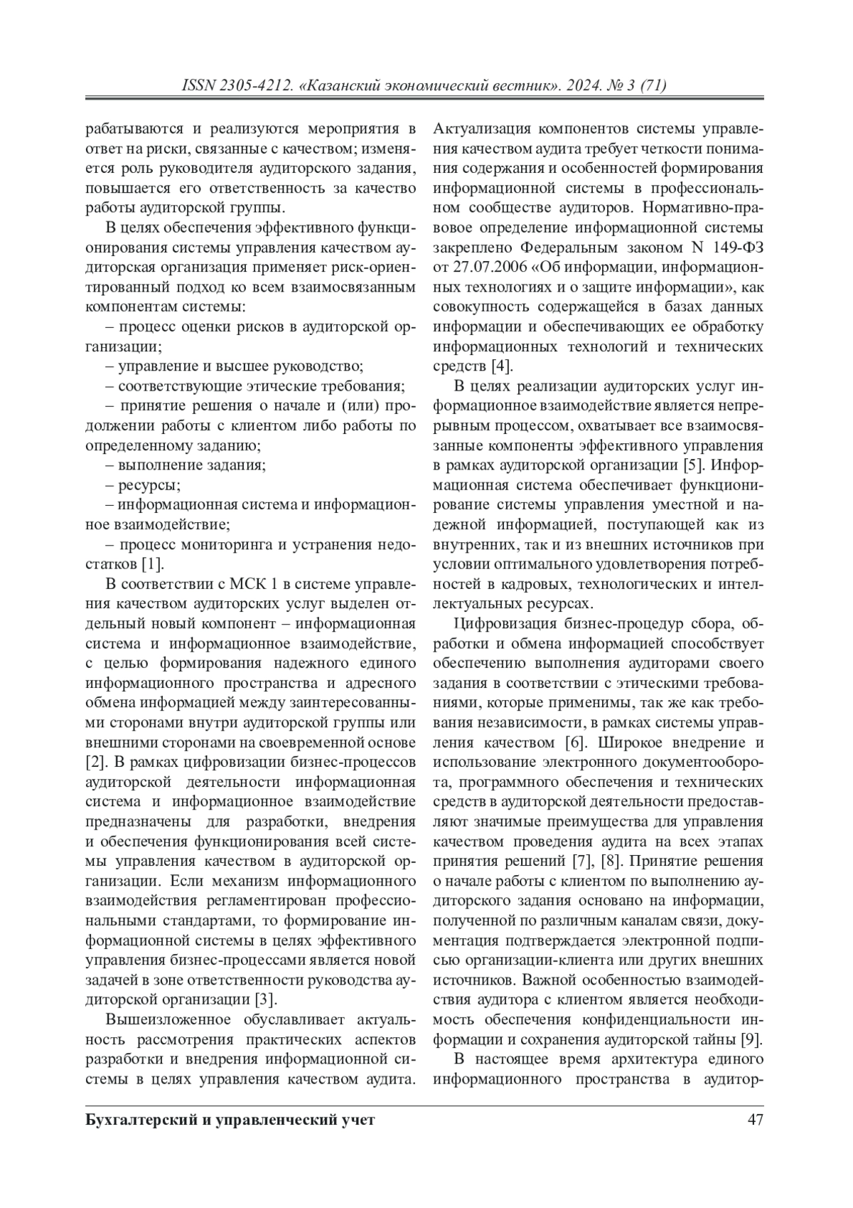 B статье рассмотрены ключевые аспекты информационной системы и информационного взаимодействия в условиях цифровизации процедур сбора, обработки, передачи, обмена и хранения рабочей документации в аудиторской организации. Данное исследование системы управления аудиторской деятельностью проводилось в соответствии с требованиями Международных стандартов управления качеством. Если механизм информационного взаимодействия регламентирован профессиональными стандартами, то формирование информационной системы в целях эффективного управления бизнес-процессами является новой задачей в зоне ответственности руководства аудиторской организации. B настоящее время архитектура единого информационного пространства в аудиторской организации зависит от масштаба и продолжительности деятельности и включает использование информационных технологий, ручных и автоматизированных способов сбора, обработки, передачи и хранения информации. B современных условиях оказание аудиторских услуг неразрывно связано с применением информационных технологий и средств обеспечения цифровой безопасности. B целях обеспечения разумной уверенности в выполнении аудиторских заданий на высоком качественном уровне руководство аудиторской организации применяет риск-ориентированный подход ко всем взаимосвязанным компонентам системы, удовлетворяет потребности в технологических, кадровых и интеллектуальных ресурсах, мотивирует аудиторов к повышению уровня профессиональных компетенций в области применения современных информационных технологий.