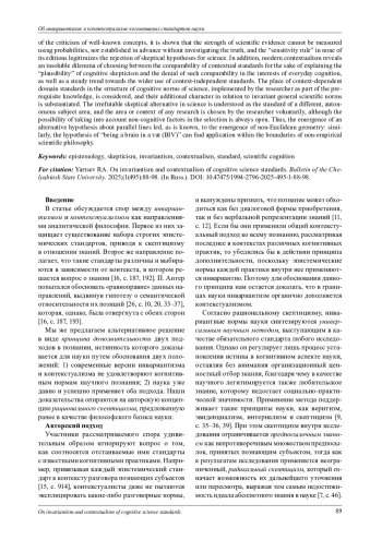 Целью статьи является обоснование принципа дополнительности подходов инвариантизма и контекстуализма при построении когнитивных норм, который пересматривает в сфере науки гипотезу о семантической относительности двух подходов. При этом показывается, что эпистемические стандарты их наиболее известных современных версий нарушают научные нормы веритизма, интернализма и эвиденциализма, ошибочно представляя когнитивну ю роль радикального скептицизма как уничтожение имеющихся знаний и вовлечение субъектов познания в «систематическую» ложь. Например, допускается исключать из доказательства те альтернативные гипотезы, которые не удовлетворяют псевдонаучному стандарту «релевантности», зависящему от действия практических факторов. В рамках критики известных концепций показывается, что силу научных доказательств нельзя ни измерять с помощью вероятностей, ни устанавливать заранее без исследования истинности, а «правило чувствительности» ни в одной из своих редакций не легитимирует для науки отклонение скептических гипотез. Кроме того, современный контекстуализм обнаруживает неразрешиму ю для него дилемму выбора между сопоставимостью контекстуальных стандартов ради объяснения «правдоподобия» познавательного скептицизма и отрицанием такой сопоставимости в интересах обыденного познания, а также устойчивый тренд к более широкому применению контекстно-независимых стандартов. Рассматривается место контекстно-зависимых стандартов предметной области в структуре когнитивных норм науки, реализуемых исследователем как часть предпосылочного знания, и обосновывается их дополнительный характер по отношению к инвариантным общенаучным нормам. Неопровергаемая же скептическая альтернатива в науке понимае тся как стандарт иной, автономной предметной области, причем область или контекст любого исследования выбираются исследователем добровольно, хотя возможность учета некогнитивных факторов при выборе всегда открыта. Так, появление альтернативной гипотезы о параллельных прямых привело, как известно, к возникновению неевклидовой геометрии: аналогично и гипотеза «быть мозгом в чане (BIV)» может найти применение в границах неэмпирической научной философии.