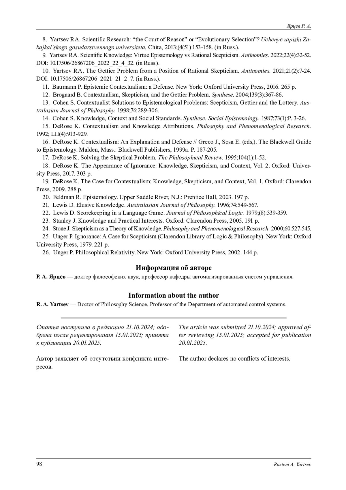 10. Ярцев Р. А. Проблема Геттиера с позиций рационального скептицизма // Антиномии. 2021. Т. 21, вып. 2. С. 7-24. 10.17506/26867206 2021 21 2 7. DOI: 10.17506/2686720620212127 EDN: GTCNID
