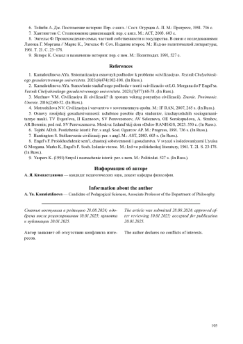 2. Камалетдинова А. Я. Становление стадиального подхода в теории “цивилизации” от Л. Г. Моргана до Ф. Энгельса // Вестник Челябинского государственного университета. 2023. № 7 (477). С. 68-78. EDN: UDDCGK