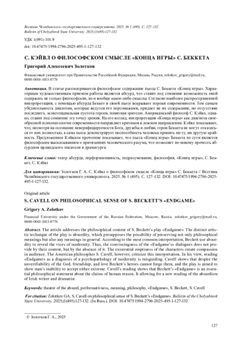 В статье рассматривается философское содержание пьесы С. Беккета «Конец игры». Характерным художественным приемом работы является абсурд, что ставит под сомнение возможность оной содержать не только философские, но и вообще какое-либо смыслы. Согласно наиболее распространенной интерпретации, с помощью абсурда Беккет в своей пьесе вскрывает пороки современности. Тем самым убедительность диалогам, которые ведутся его персонажами, придает не их содержание, но отсутствие последнего, экзистенциальная пустота героев, понятная зрителю. Американский философ С. Кэйвл, однако, ставит под сомнение эту точку зрения. На его взгляд, интерпретация «Конца игры» как диагноза своеобразной психопатологии современности направляет критиков в ложном направлении. Кэйвл показывает, что, несмотря на осознание неверифицируемости Бога, дружбы и любви, герои Беккета не могут отказаться от них полностью, а сама пьеса демонстрирует неспособность человека принять ни ту, ни другую крайность. Предложенное Кэйвлом прочтение показывает, что пьеса «Конец игры» Беккета по сути является философским высказыванием о притязаниях человеческого разума, что позволяет по-новому прочесть абсурдизм ирландского писателя и драматурга.