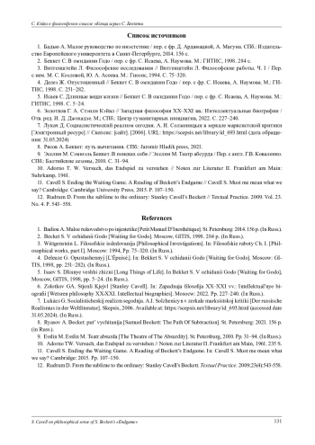 12. Rudrum D. From the sublime to the ordinary: Stanley Cavell’s Beckett // Textual Practice. 2009. Vol. 23. No. 4. P. 543-558.
