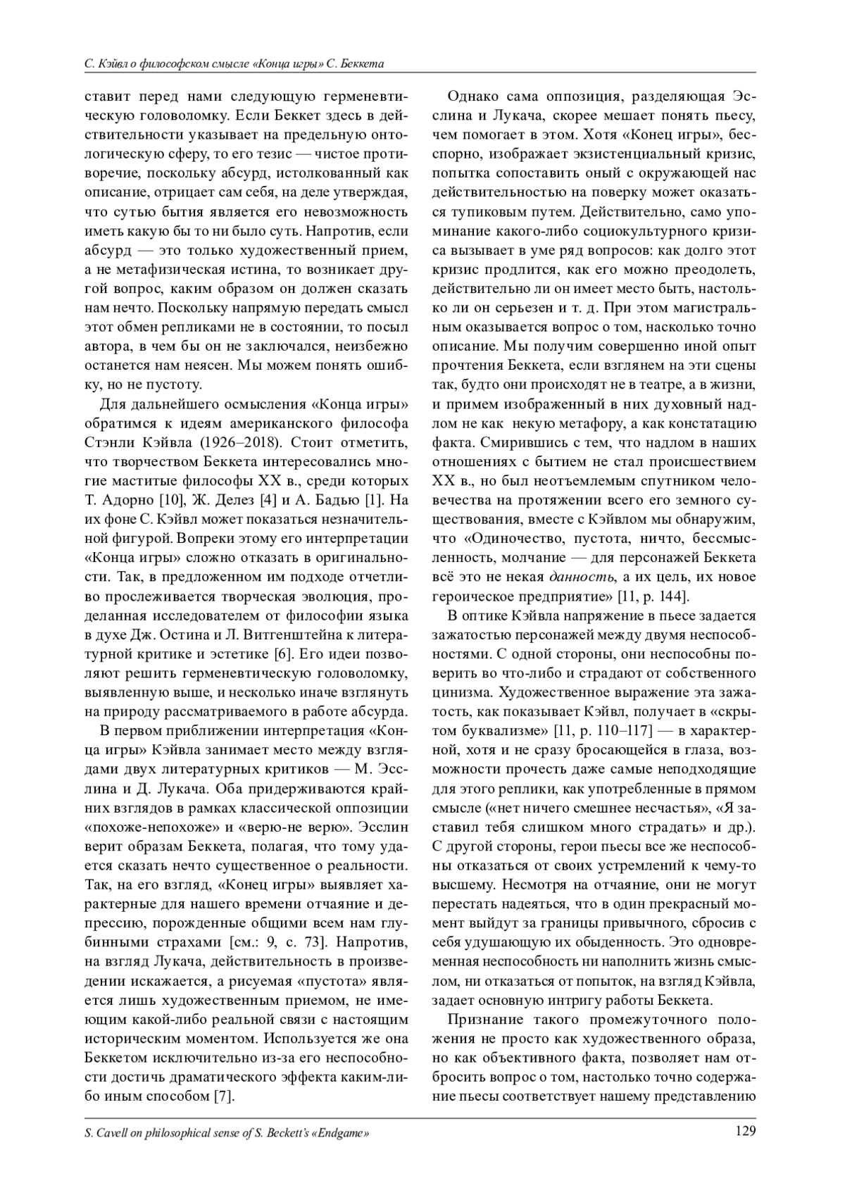 11. Cavell S. Ending the Waiting Game. A Reading of Beckett’s Endgame // Cavell S. Must me mean what we say? Cambridge: Cambridge University Press, 2015. P. 107-150.