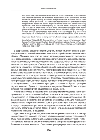 Статья посвящена анализу трансформации женских образов как репрезентации, идеологически обусловленной культурным и историческим процессом. Исследование выявляет традиционные культурные коды, сформированные неоконфуцианской этикой, определяющей роли женщин в социуме («мудрая мать и добрая жена») и их положение в художественной традиции эпохи Чосон. В ХХ ХХ1 веках на фоне стремительной модернизации страны и попытки достичь гендерного равенства, женский образ стал важной частью культурного производства Южной Кореи. В работе рассматривается влияние женских образов Кореи эпохи Чосон, а также глобальных феминистских дискурсов на творчество ключевых фигур современного искусства Южной Кореи, таких как Юн Соннам, Чо Ён Чу и Ли Буль. Их работы служат инструментом деконструкции патриархальных норм, гендерных стереотипов и навязанных стандартов, а также конструирования нового образа женщины. Через перформансы, инсталляции и визуальные образы они поднимают проблемы самоидентификации женщин, исследуют темы материнства и социального давления.