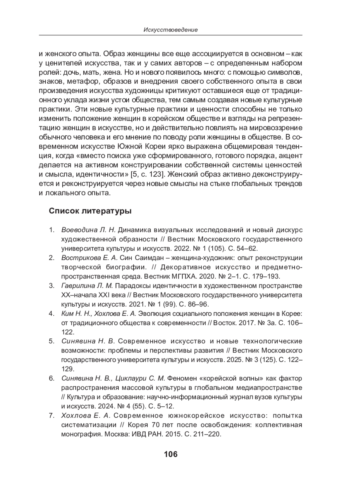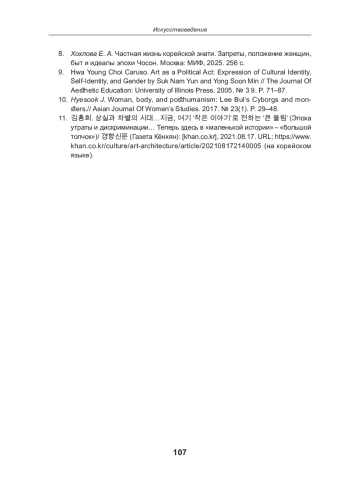4. Ким Н. Н., Хохлова Е. А. Эволюция социального положения женщин в Корее: от традиционного общества к современности // Восток. 2017. № 3а. С. 106122.