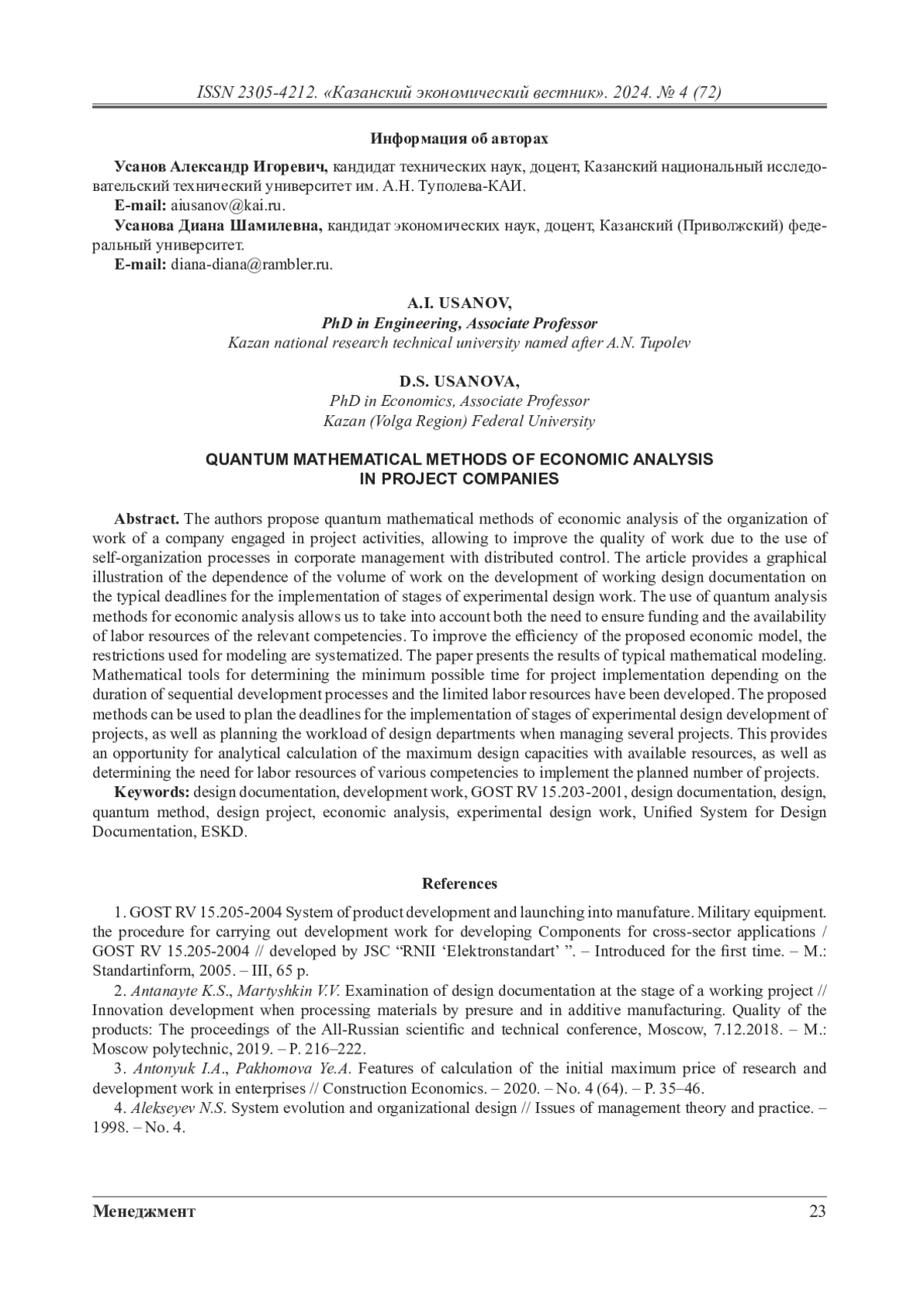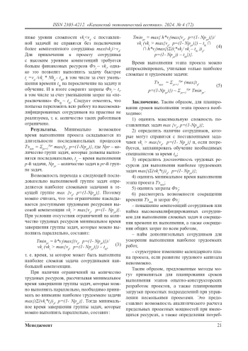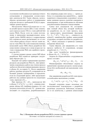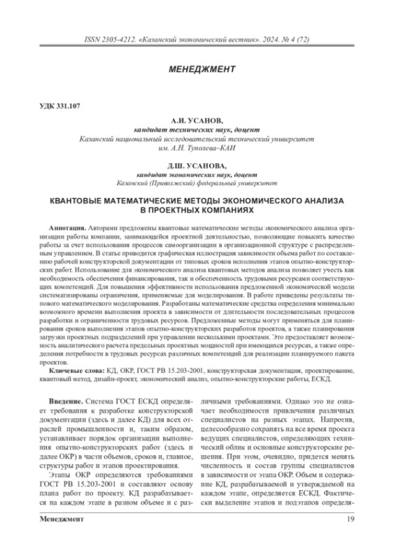 Авторами предложены квантовые математические методы экономического анализа организации работы компании, занимающейся проектной деятельностью, позволяющие повысить качество работы за счет использования процессов самоорганизации в организационной структуре с распределенным управлением. В статье приводится графическая иллюстрация зависимости объема работ по составлению рабочей конструкторской документации от типовых сроков исполнения этапов опытно-конструкторских работ. Использование для экономического анализа квантовых методов анализа позволяет учесть как необходимость обеспечения финансирования, так и обеспеченность трудовыми ресурсами соответствующих компетенций. Для повышения эффективности использования предложенной экономической модели систематизированы ограничения, применяемые для моделирования. В работе приведены результаты типового математического моделирования. Разработаны математические средства определения минимально возможного времени выполнения проекта в зависимости от длительности последовательных процессов разработки и ограниченности трудовых ресурсов. Предложенные методы могут применяться для планирования сроков выполнения этапов опытно-конструкторских разработок проектов, а также планирования загрузки проектных подразделений при управлении несколькими проектами. Это предоставляет возможность аналитического расчета предельных проектных мощностей при имеющихся ресурсах, а также определения потребности в трудовых ресурсах различных компетенций для реализации планируемого пакета проектов
