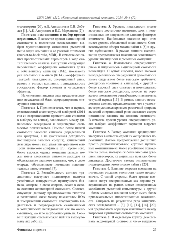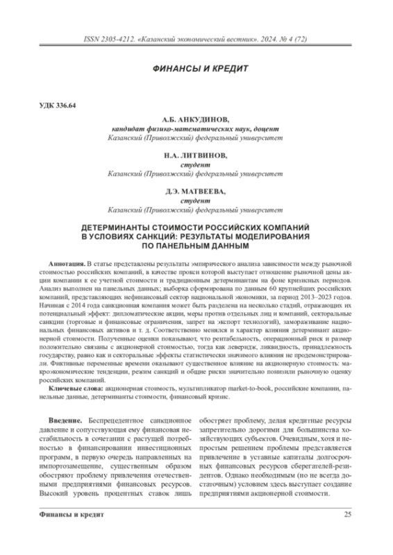 2. Анкудинов А.Б., Марханова Е.С. Эмпирический анализ драйверов стоимости российских компаний: результаты статистического моделирования на панельных данных // Экономический вестник РТ. - 2016. - № 3. - С. 43-50.