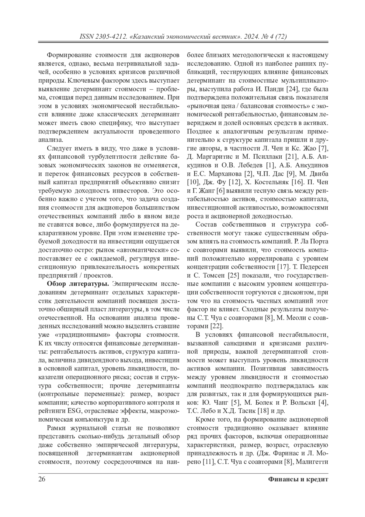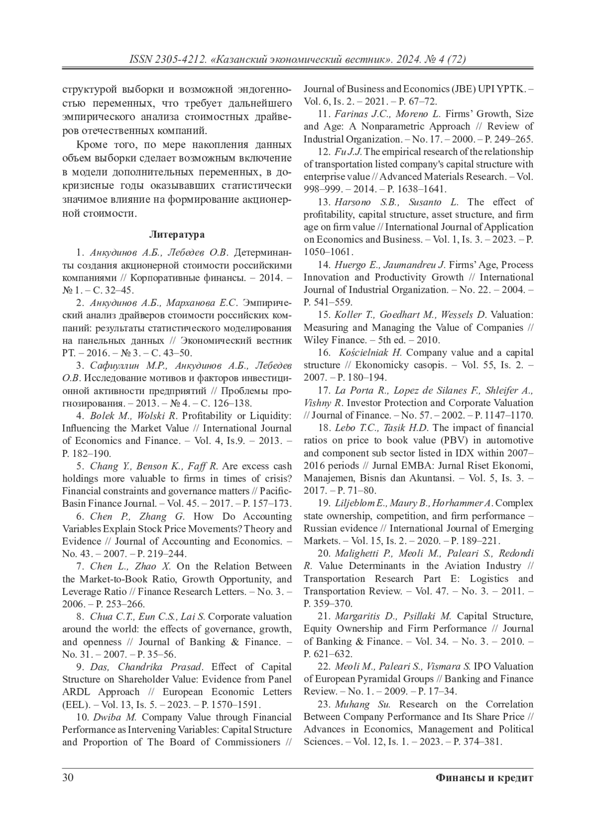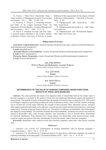 1. Анкудинов А.Б., Лебедев О.В. Детерминанты создания акционерной стоимости российскими компаниями // Корпоративные финансы. - 2014. - № 1. - С. 32-45.