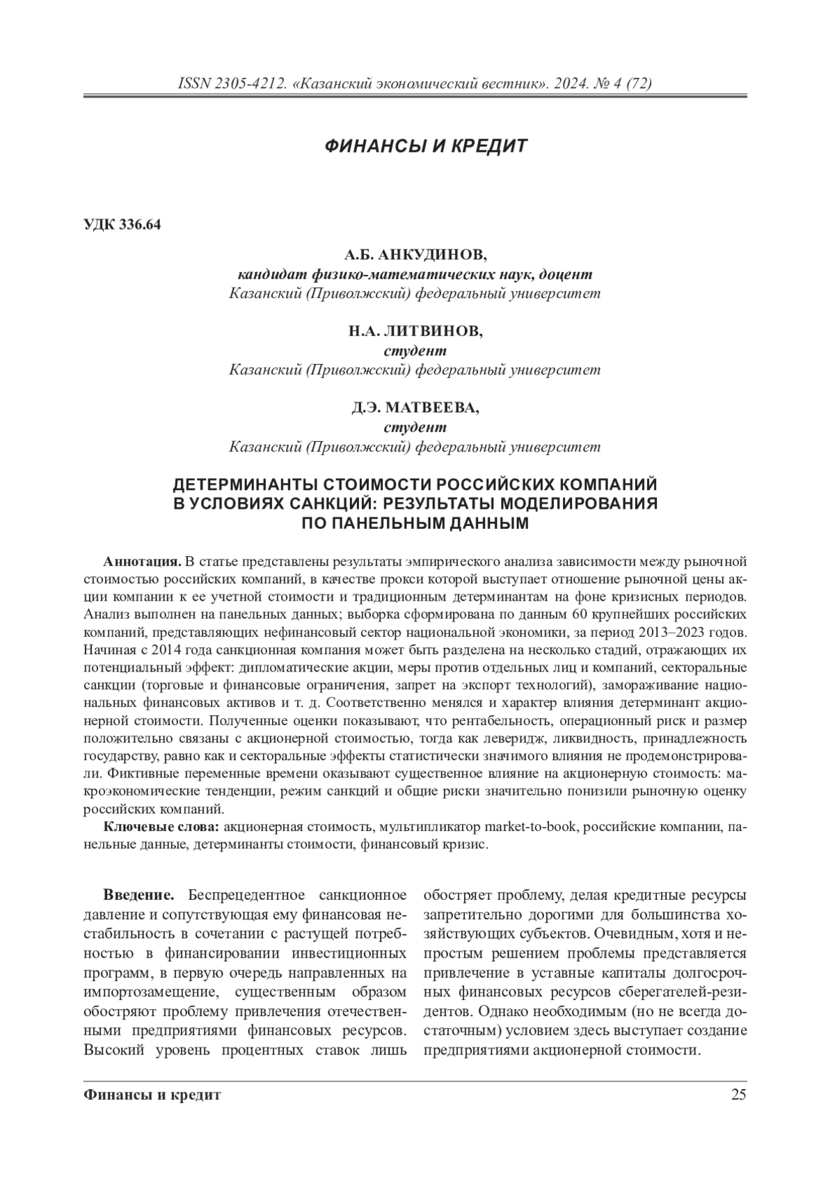 В статье представлены результаты эмпирического анализа зависимости между рыночной стоимостью российских компаний, в качестве прокси которой выступает отношение рыночной цены акции компании к ее учетной стоимости и традиционным детерминантам на фоне кризисных периодов. Анализ выполнен на панельных данных; выборка сформирована по данным 60 крупнейших российских компаний, представляющих нефинансовый сектор национальной экономики, за период 2013–2023 годов. Начиная с 2014 года санкционная компания может быть разделена на несколько стадий, отражающих их потенциальный эффект: дипломатические акции, меры против отдельных лиц и компаний, секторальные санкции (торговые и финансовые ограничения, запрет на экспорт технологий), замораживание национальных финансовых активов и т. д. Соответственно менялся и характер влияния детерминант акционерной стоимости. Полученные оценки показывают, что рентабельность, операционный риск и размер положительно связаны с акционерной стоимостью, тогда как леверидж, ликвидность, принадлежность государству, равно как и секторальные эффекты статистически значимого влияния не продемонстрировали. Фиктивные переменные времени оказывают существенное влияние на акционерную стоимость: макроэкономические тенденции, режим санкций и общие риски значительно понизили рыночную оценку российских компаний.