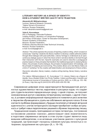Статья посвящена процессу обучения творческому письму, основу которого составляет сознательное «вписывание» студента в литературную традицию для формирования у него устойчивой авторской позиции через непосредственный диалог с авторитетами прошлого. Литературное наследие понимается как открытое непрерывное диалогическое пространство, в котором формируется нарративная идентичность будущего писателя через его взаимодействие с текстом. На конкретных примерах описывается педагогическая практика, основанная на трех принципах, трансформирующих традиционный подход к изучению истории литературы: принцип активного диалога, принцип субъективации знания и принцип освоения и преодоления. Представленная практика позволяет рассматривать историю литературы как своего рода «мастерскую» творческого самоопределения и развития будущих литераторов.