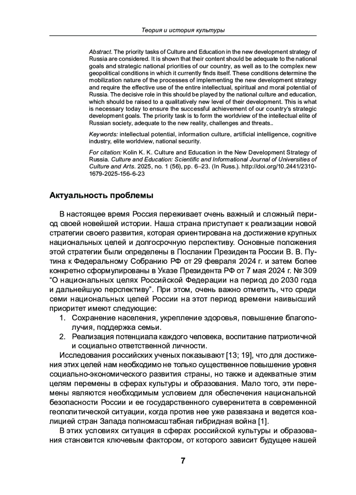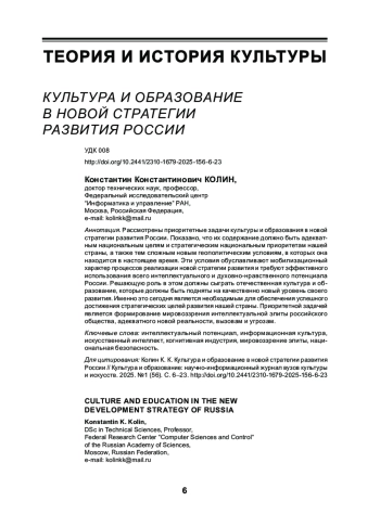Рассмотрены приоритетные задачи культуры и образования в новой стратегии развития России. Показано, что их содержание должно быть адекватным национальным целям и стратегическим национальным приоритетам нашей страны, а также тем сложным новым геополитическим условиям, в которых она находится в настоящее время. Эти условия обуславливают мобилизационный характер процессов реализации новой стратегии развития и требуют эффективного использования всего интеллектуального и духовно нравственного потенциала России. Решающую роль в этом должны сыграть отечественная культура и образование, которые должны быть подняты на качественно новый уровень своего развития. Именно это сегодня является необходимым для обеспечения успешного достижения стратегических целей развития нашей страны. Приоритетной задачей является формирование мировоззрения интеллектуальной элиты российского общества, адекватного новой реальности, вызовам и угрозам.