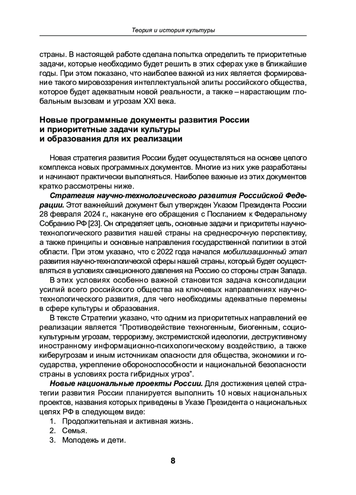 В настоящее время Россия переживает очень важный и сложный период своей новейшей истории. Наша страна приступает к реализации новой стратегии своего развития, которая ориентирована на достижение крупных национальных целей и долгосрочную перспективу. Основные положения этой стратегии были определены в Послании Президента России В. В. Путина к Федеральному Собранию РФ от 29 февраля 2024 г. и затем более конкретно сформулированы в Указе Президента РФ от 7 мая 2024 г. № 309 “О национальных целях Российской Федерации на период до 2030 года и дальнейшую перспективу”.