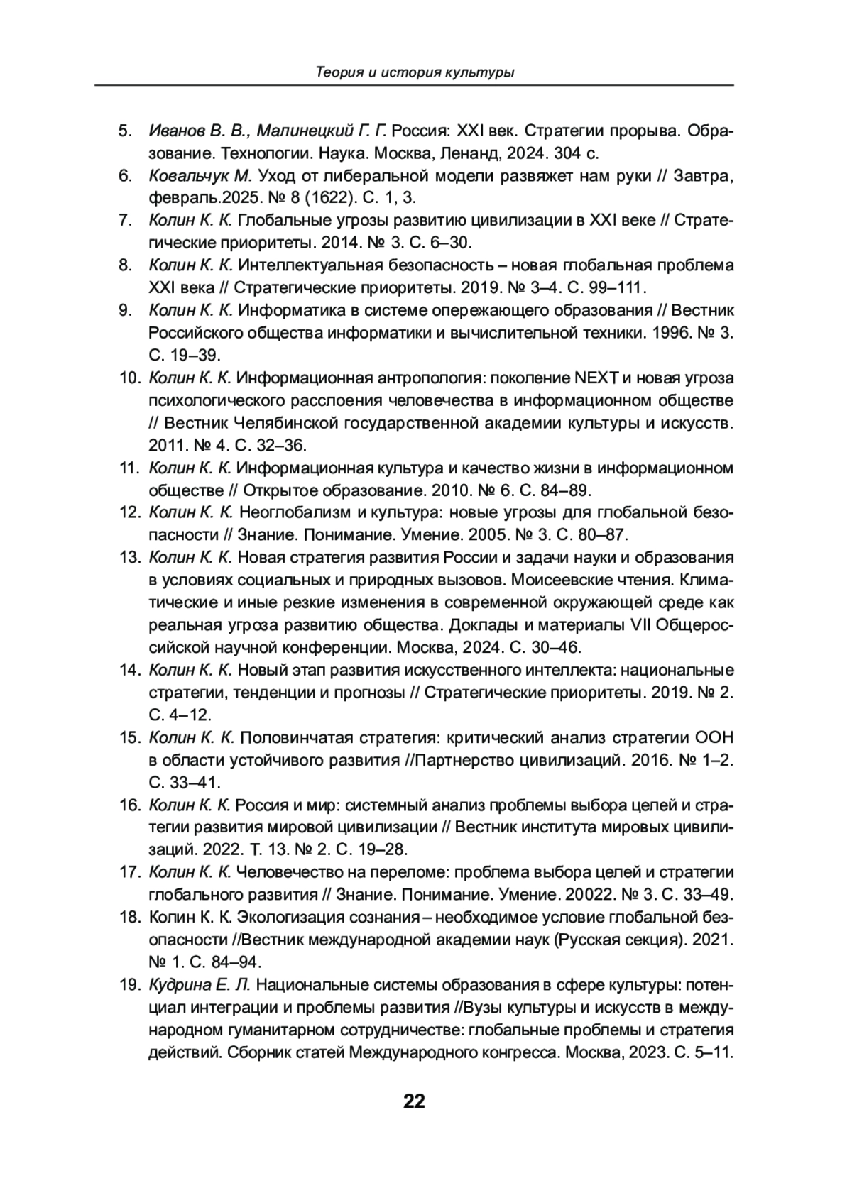 16. Колин К. К. Россия и мир: системный анализ проблемы выбора целей и стратегии развития мировой цивилизации // Вестник института мировых цивилизаций. 2022. Т. 13. № 2. С. 19-28. EDN: ZEZSWY