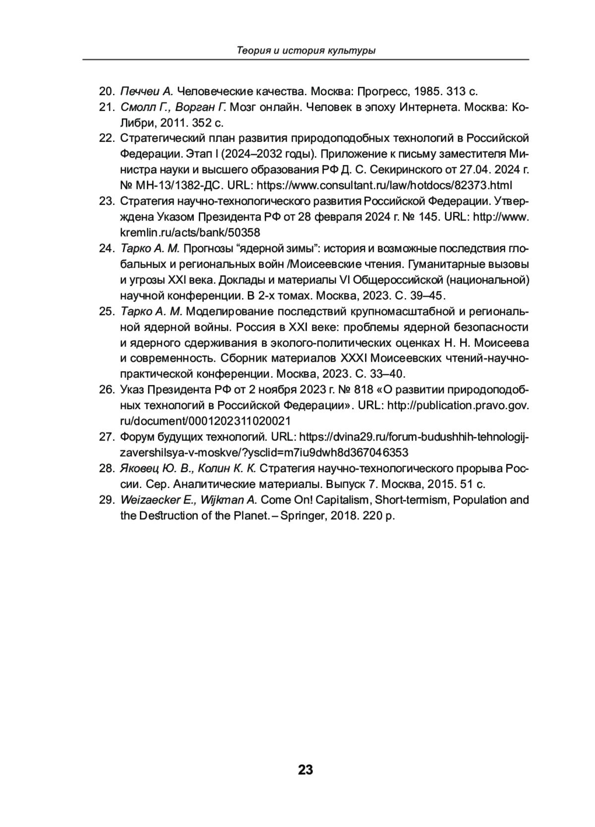 13. Колин К. К. Новая стратегия развития России и задачи науки и образования в условиях социальных и природных вызовов. Моисеевские чтения. Климатические и иные резкие изменения в современной окружающей среде как реальная угроза развитию общества. Доклады и материалы VII Общероссийской научной конференции. Москва, 2024. С. 30-46. EDN: FKXROC