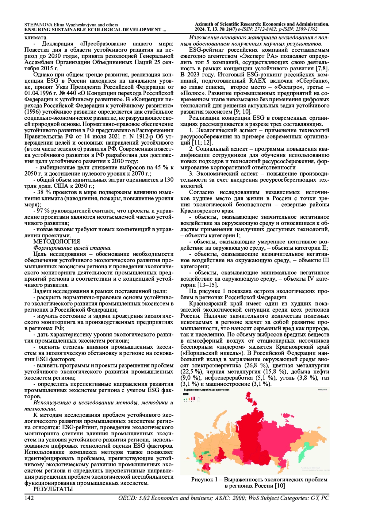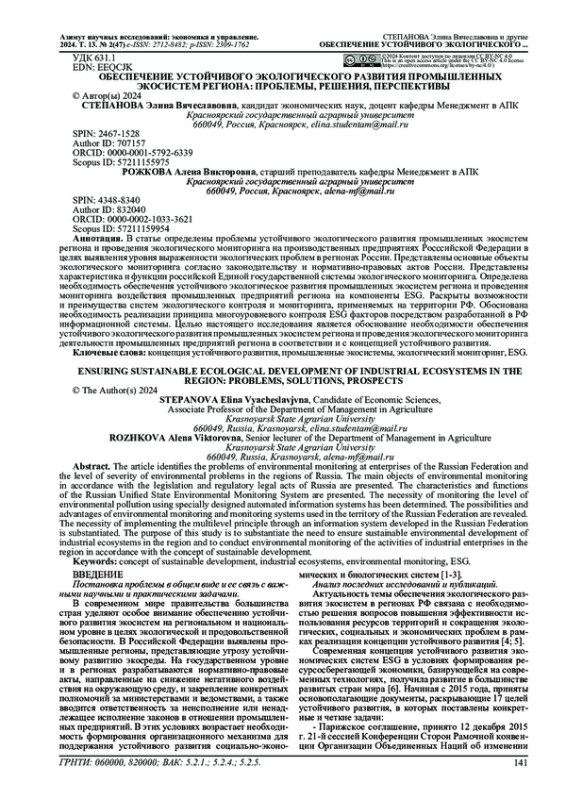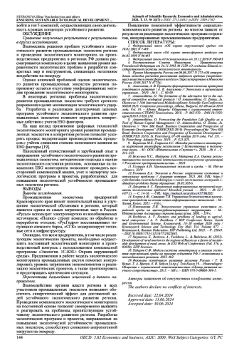В статье определены проблемы устойчивого экологического развития промышленных экосистем региона и проведения экологического мониторинга на производственных предприятиях Российской Федерации в целях выявления уровня выраженности экологических проблем в регионах России. Представлены основные объекты экологического мониторинга согласно законодательства и нормативно-правовых актов России. Представлены характеристика и функции российской Единой государственной системы экологического мониторинга. Определена необходимость обеспечения устойчивого экологическое развития промышленных экосистем региона и проведения мониторинга воздействия промышленных предприятий региона на компоненты ESG. Раскрыты возможности и преимущества систем экологического контроля и мониторинга, применяемых на территории РФ. Обоснована необходимость реализации принципа многоуровневого контроля ESG факторов посредством разработанной в РФ информационной системы. Целью настоящего исследования является обоснование необходимости обеспечения устойчивого экологического развития промышленных экосистем региона и проведения экологического мониторинга деятельности промышленных предприятий региона в соответствии и с концепцией устойчивого развития.