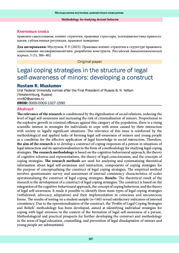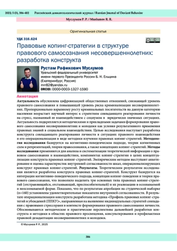 Актуальность обусловлена цифровизацией общественных отношений, снижающей уровень правового самосознания и повышающей уровень риска криминализации несовершеннолетних. Пропорционально взрывному росту криминальных посягательств на данную категорию населения возрастает научный интерес к стратегиям совладающего реагирования личности на стресс, вызванный ее взаимодействием с социумом в юридически значимых ситуациях. Актуальность подкрепляется методическими и прикладными задачами формирования правового самосознания несовершеннолетних и молодежи как условия результативного применения правовых знаний в социальном взаимодействии. Целью исследования выступает разработка конструкта совладающего реагирования личности в ситуациях правового взаимодействия и его операционализация в виде методики изучения правовых копинг-стратегий. Методология исследования базируется на когнитивно-поведенческом подходе, теории когнитивных схем и репрезентаций, теории правосознания, а также концепциях копинг-стратегий. Методы исследования применяются для анализа и систематизации теоретической информации о правовом самосознании и взаимодействии, компонентах копинг-стратегии в целях концептуализации конструкта правовых копинг-стратегий. Эмпирическим методом выступают анкетирование и оценка характеристик внутренней согласованности шкал, операционализирующих конструкт правовых копинг-стратегий. Результаты. Теоретическим результатом исследования является разработка конструкта правовых копинг-стратегий. Конструкт базируется на интеграции когнитивно-поведенческого подхода, концепции копинг-поведения и теории правового самосознания, что позволило выделить три основных типа правовых копинг-стратегий (отстраняющийся, отстаивающий, приспособительный) и их реализацию в осознаваемой и неосознаваемой форме. Показано, что по результатам апробации на студенческой выборке (n=160) установлены удовлетворительные показатели внутренней согласованности. В результате операционализации конструкта разработана методика «Профиль правовых копинг-стратегий и убеждений (ППКУ)», направленная на выявление индивидуальных стратегий совладания с правовыми стрессорами в контексте формирования правового самосознания личности. Обосновываются методические и практические перспективы дальнейшей разработки конструкта и методики в областях правового просвещения, консультирования и профилактики правовой дезадаптации несовершеннолетних и молодежи.
