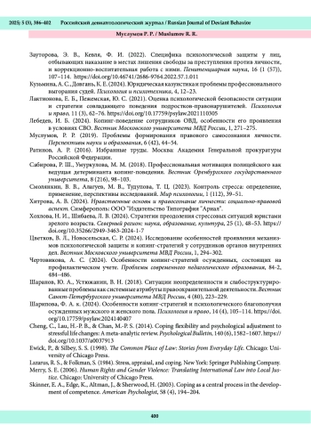 9. Лебедев, И. Б. (2024). Копинг-поведение сотрудников ОВД, особенности его проявления в условиях СВО. Вестник Московского университета МВД России, 1, 271-275.