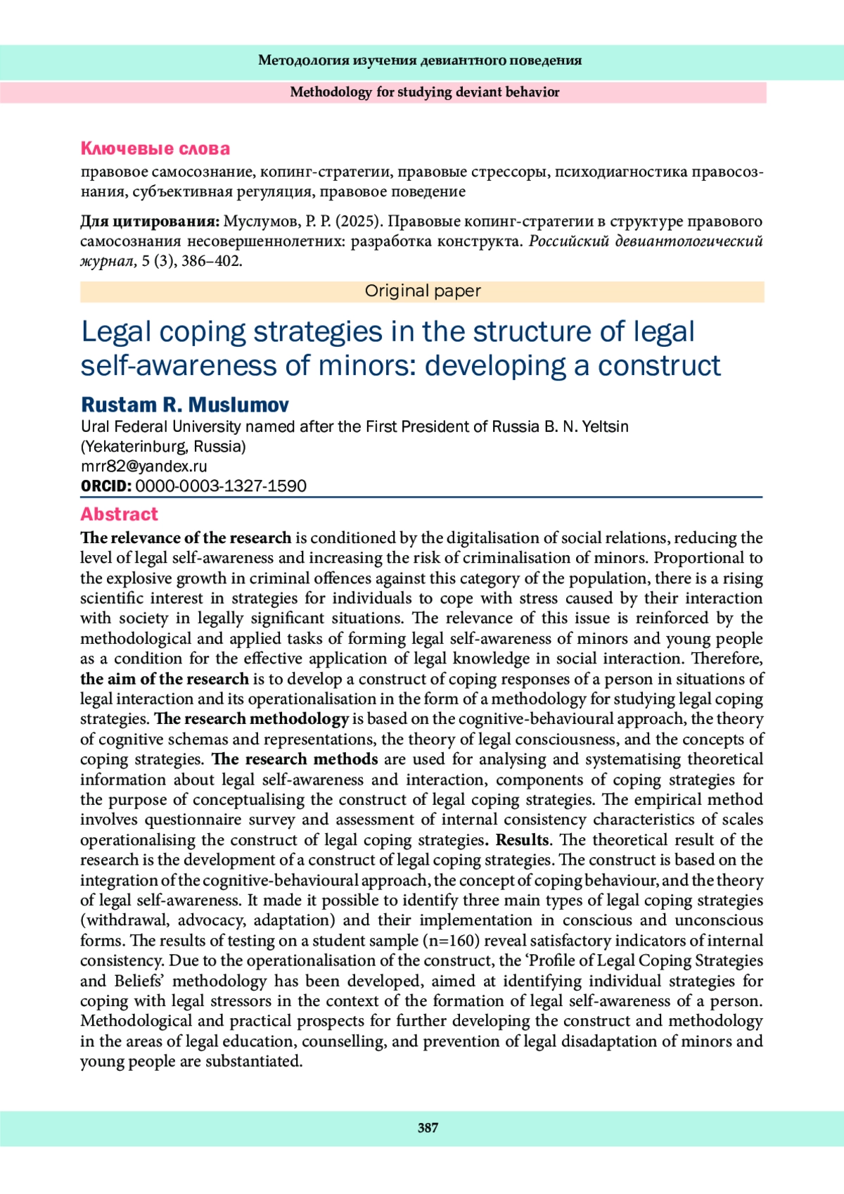В последние годы возрастает интерес к исследованию правового самосознания личности как одного из центральных факторов правового поведения и успешной социальной адаптации молодежи. Современные социокультурные трансформации, вызванные процессами цифровизации, усиливающаяся правовая неопределенность и риски правового нигилизма обусловливают потребность в более глубоком теоретическом и эмпирическом осмыслении механизмов становления и функционирования правового самосознания подрастающего поколения. Наряду с ростом криминальных посягательств, использующих правовую неосведомленность несовершеннолетних и молодежи в качестве инструмента принуждения к противоправным действиям, приобретает актуальность проблематика их правового самосознания – способность давать правовую оценку не только своим действиям, но и действиям окружающих. Особого внимания заслуживают стратегии совладания со стрессорами, определяющие способность осуществлять правовое взаимодействие, в том числе с субъектами правоприменения.